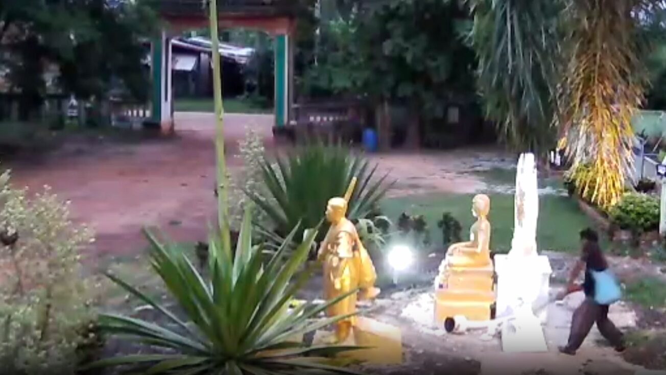 ต่อมา กำนันนิรุธไปที่ดูวัดซึ่งนายบุญมีทุบทำลายธรรมจักร จนแตกหัก รวมทั้งรูปปั้นพระสีวลี ที่ตั้งอยู่ในบริเวณเดียวกัน ได้รับความเสียหาย ทั่วทั้งบริเวณ โดยนายบุญมีเคยเข้าไปก่อเหตุใช้จอบทุบทำลายธรรมจักรครั้งนี้เป็นครั้งที่ 2 ครั้งแรกที่ทุบไม่มีหลักฐานมัดตัว หลังจากนั้นได้ติดตั้งกล้องวงจรปิด เห็นผู้ก่อเหตุชัดเจน