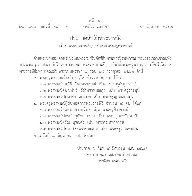 วันที่ 5 มิ.ย.2567 ราชกิจจานุเบกษา เผยแพร่ ประกาศสำนักพระราชวัง เรื่อง พระราชทานสัญญาบัตรตั้งพระครูพราหมณ์ ด้วยพระบาทสมเด็จพระเจ้าอยู่หัว ทรงพระกรุณาโปรดเกล้าฯ พระราชทานสัญญาบัตรตั้งพระครูพราหมณ์ เนื่องในโอกาสพระราชพิธีมหามงคลเฉลิมพระชนมพรรษา 6 รอบ 28 กรกฎาคม 2567 ดังนี้