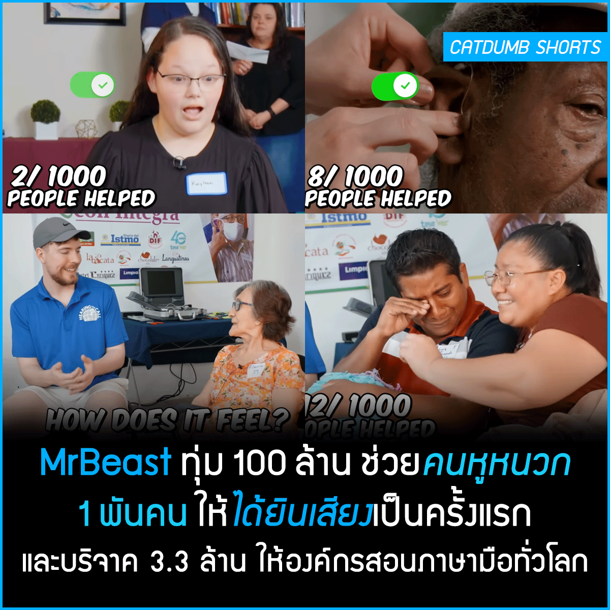 MrBeast ทุ่ม 100 ล้าน ช่วยคนหูหนวก 1 พันคน ให้กลับมาได้ยินเสียงครั้งแรก และบริจาคเงิน 3.3 ล้าน ให้องค์กรสอนภาษามือทั่วโลก