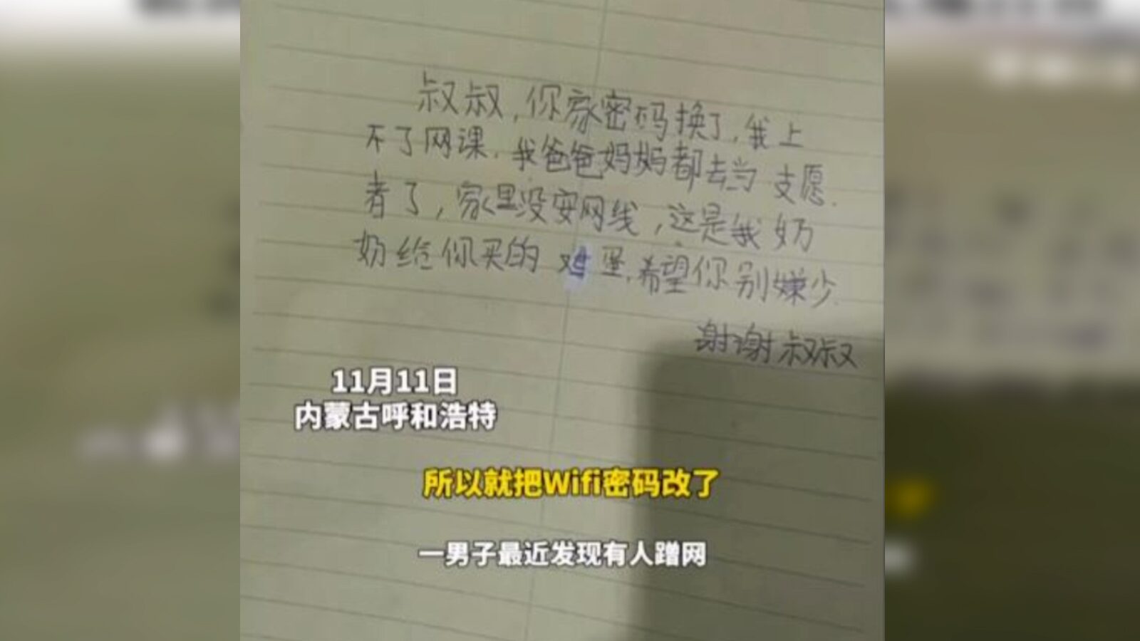 โดยข้อความระบุว่า "คุณลุง รหัสผ่านถูกเปลี่ยนแล้ว ผมเรียนออนไลน์ไม่ได้ พ่อแม่ของผมต่างทำงานเป็นอาสาสมัคร และที่ห้องของเราไม่มีอินเทอร์เน็ต นี่เป็นไข่ที่คุณยายผมซื้อมาฝากคุณลุง หวังว่าคุณลุงจะไม่ว่าอะไร ขอบคุณครับ"