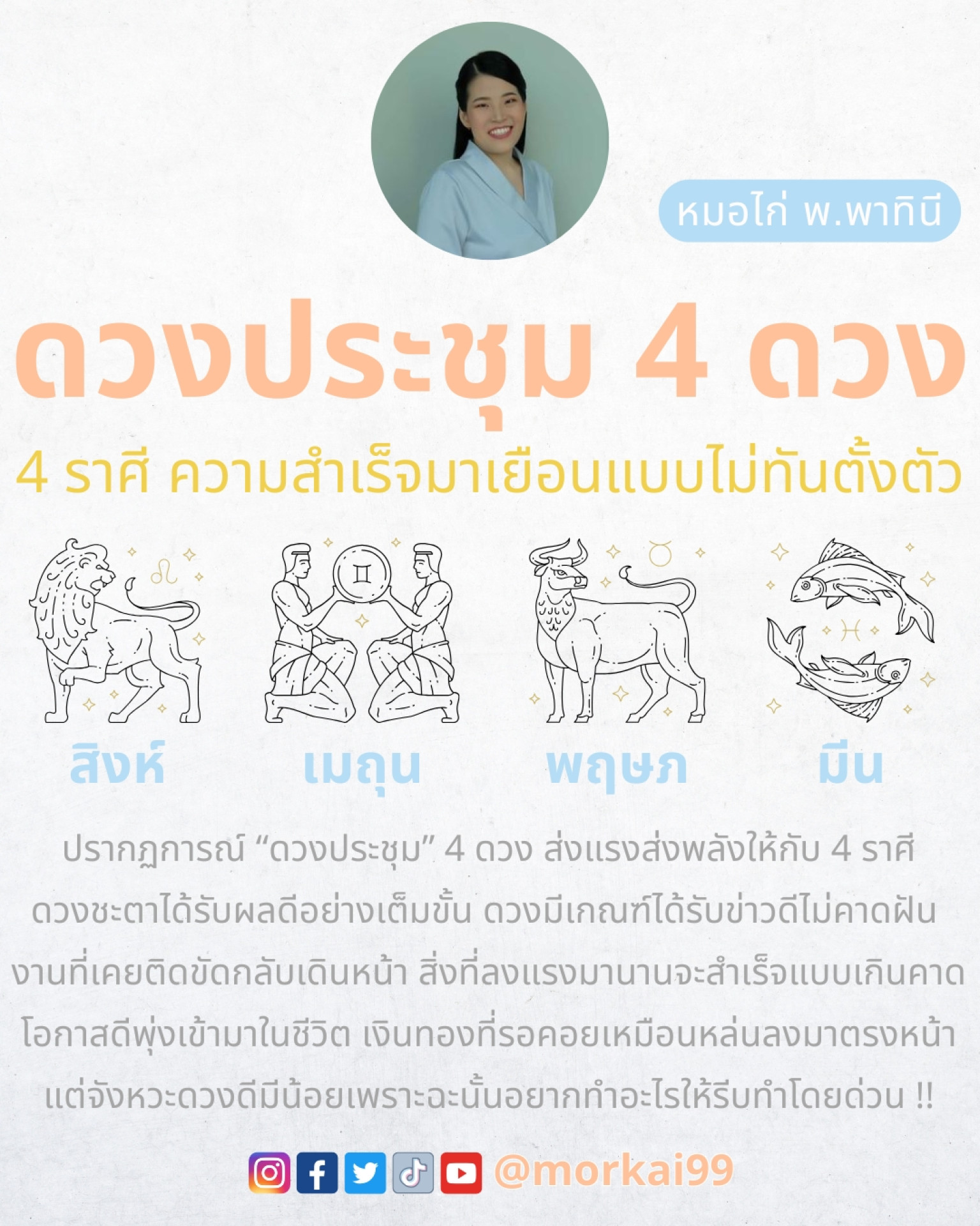 วันที่ 25 ก.ค.68 "หมอไก่" นักพยากรณ์ชื่อดัง โพสต์ข้อความผ่านอินสตาแกรม @morkai99 ระบุว่า… เมื่อดาวประขุมรวมตัว 4 ดวง !! ด...