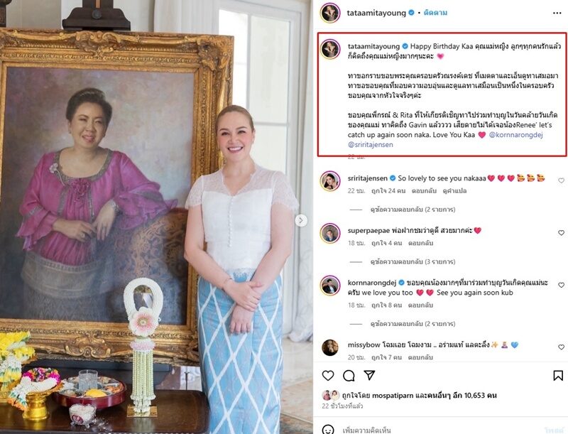 ถือเป็นงานใหญ่ของตระกูลณรงค์เดช โดย ทาทา ยัง โพสต์โมเมนต์ประทับใจได้ไปร่วมทำบุญวันเกิด คุณหญิงพรทิพย์ ณรงค์เดช พร้อมแคปชั่นอวยพรวันเกิดคุณแม่หญิงที่ยังอยู่ในใจเสมอด้วยว่า