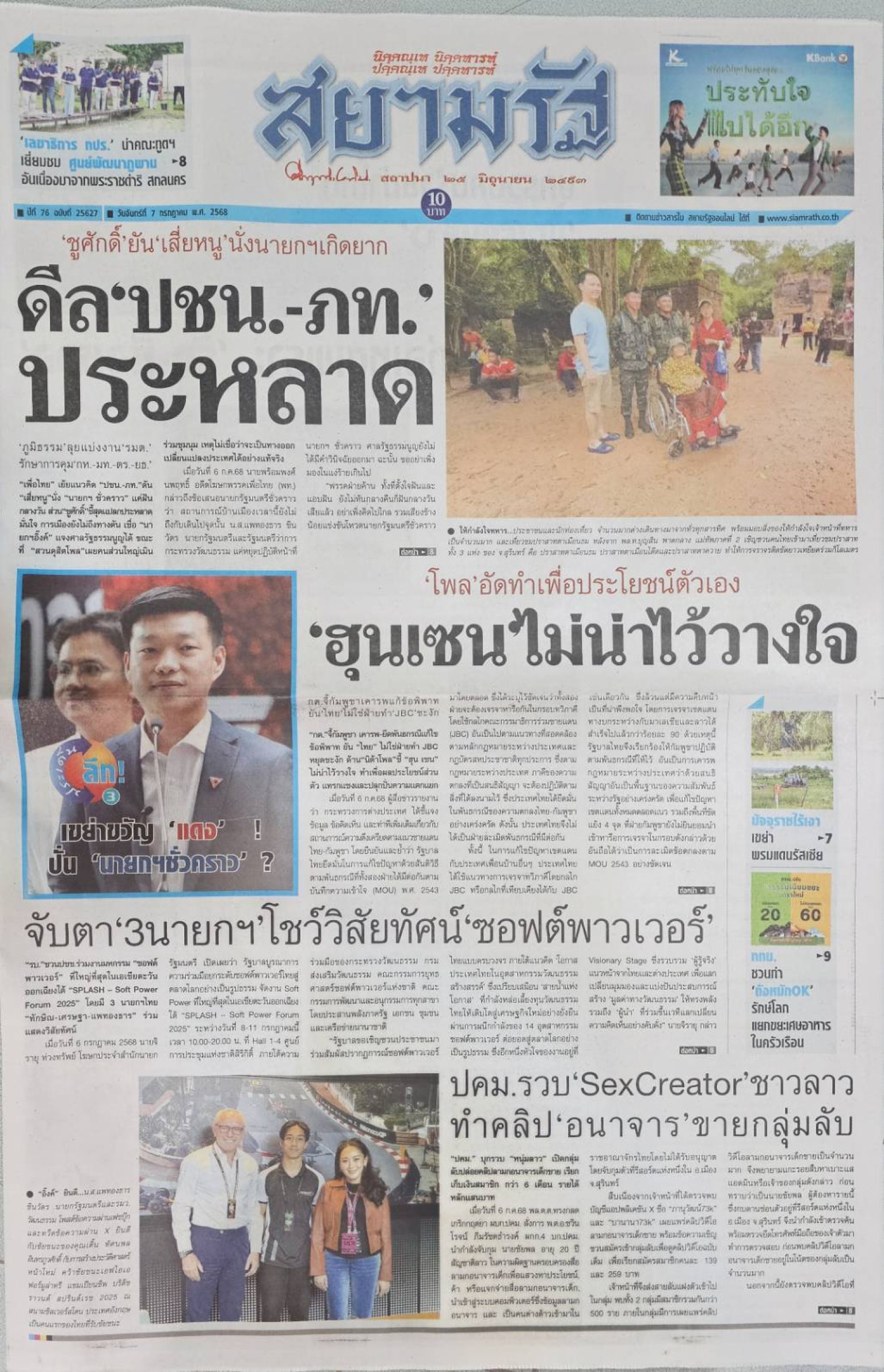 หน้า 1 หนังสือพิมพ์สยามรัฐรายวัน ฉบับวันจันทร์ที่ 7 กรกฎาคม 2568
