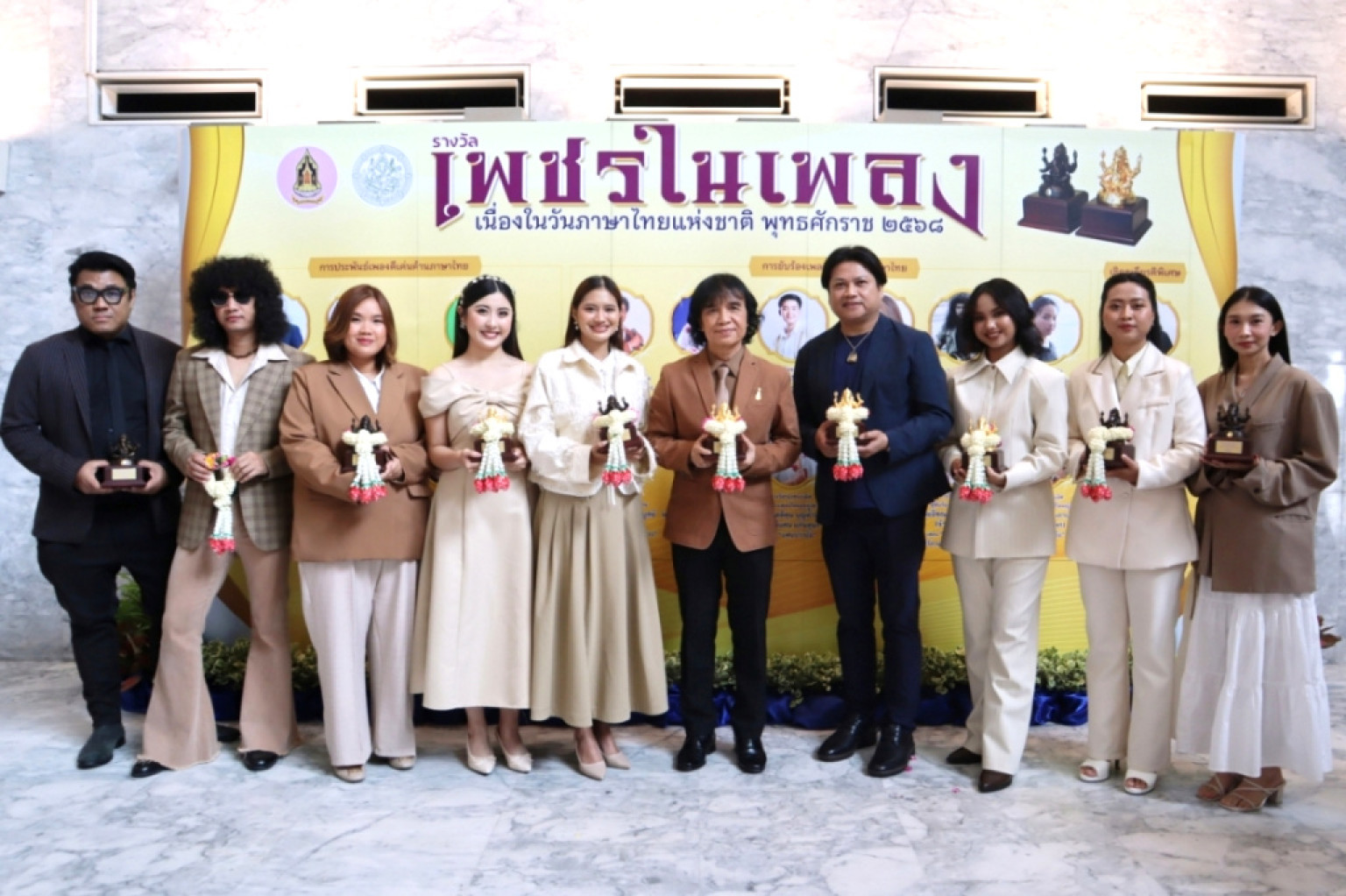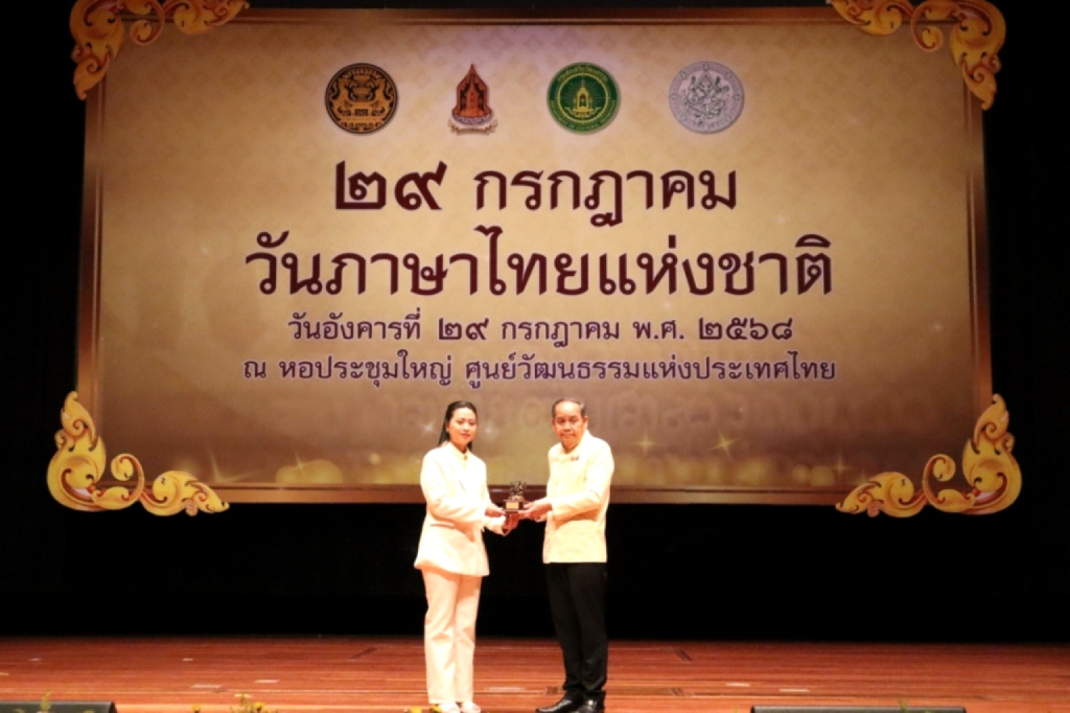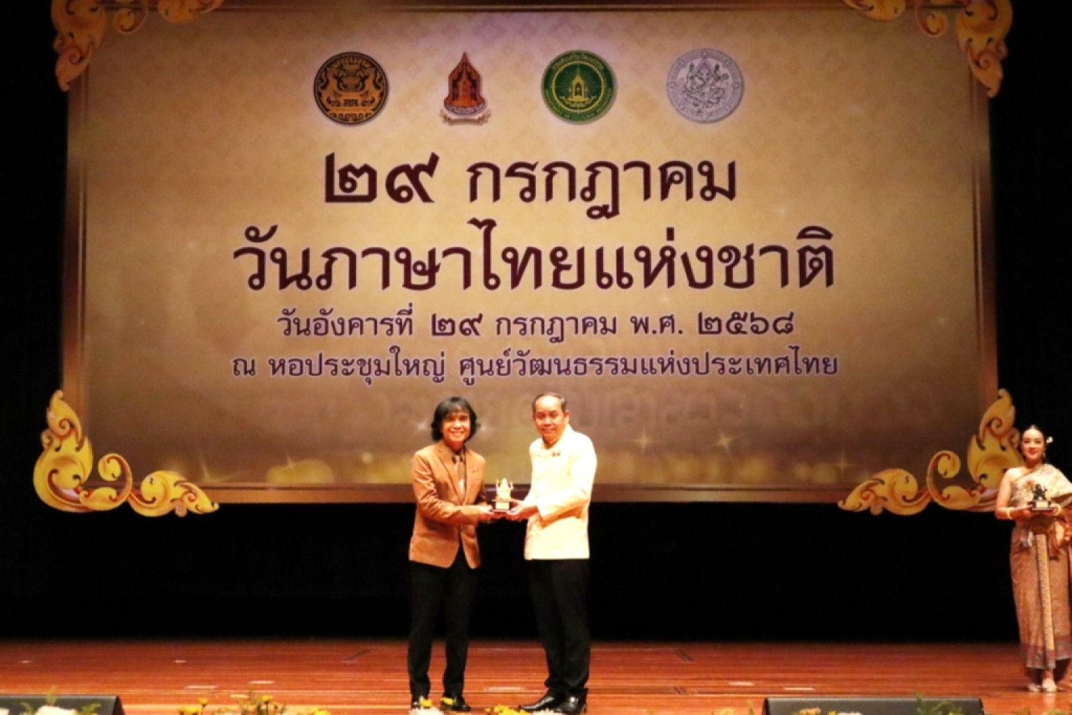 เนื่องในวันภาษาไทยแห่งชาติ พ.ศ. 2568 โดยมี ประสพ เรียงเงิน ปลัดกระทรวงวัฒนธรรม ยุถิกา อิศรางกูร ณ อยุธยา อธิบดีกรมส่งเสริมวัฒนธรรม และ พนมบุตร จันทรโชติ อธิบดีกรมศิลปากร ร่วมงาน พร้อมแสดงความยินดีแก่ศิลปินที่มีบทบาทสำคัญในการสื่อสารคุณค่าของภาษาไทยผ่านบทเพลง ณ หอประชุมใหญ่ ศูนย์วัฒนธรรมแห่งประเทศไทย