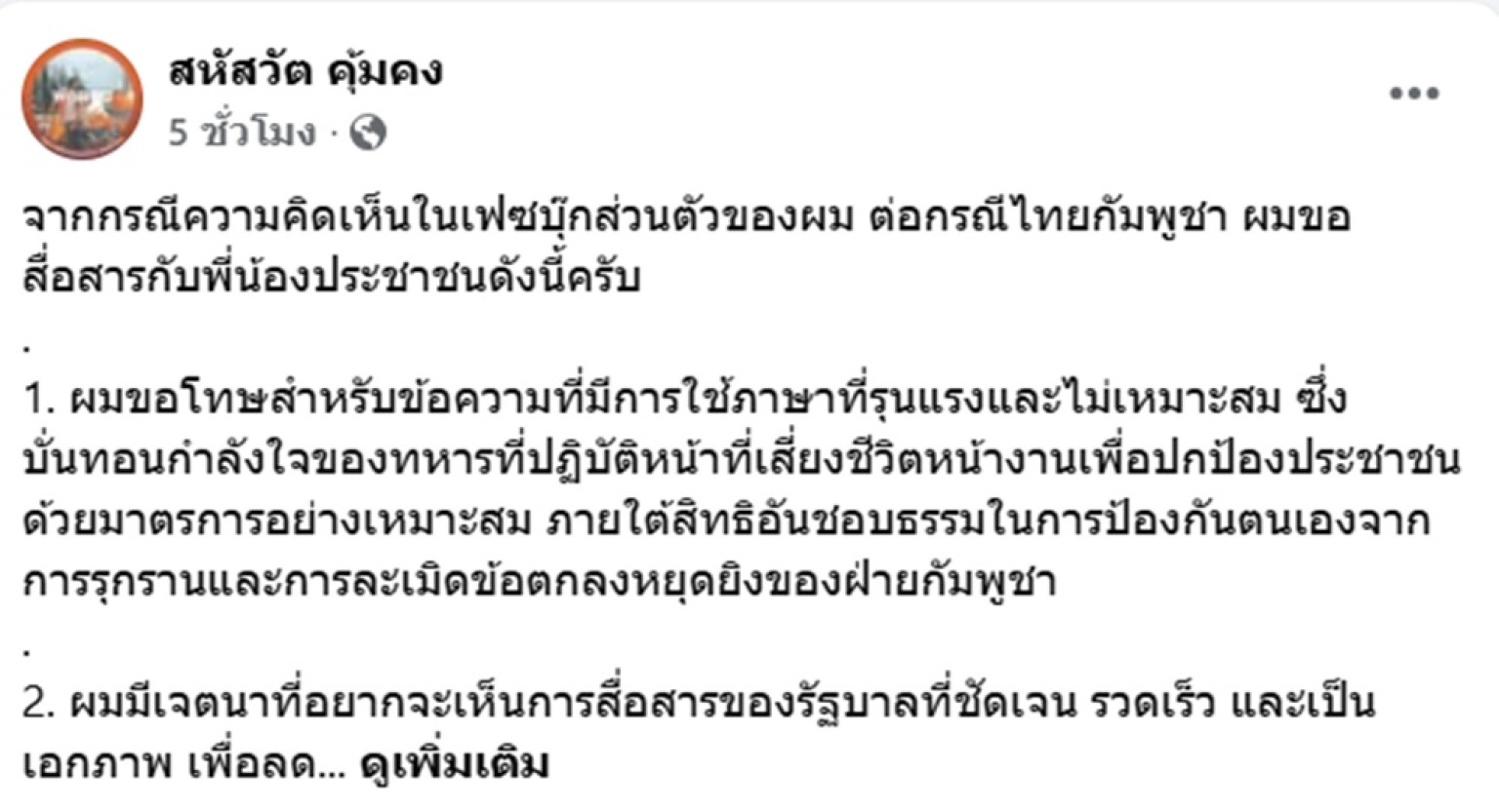 ”จากกรณีความคิดเห็นในเฟซบุ๊กส่วนตัวของผม ต่อกรณีไทยกัมพูชา ผมขอสื่อสารกับพี่น้องประชาชนดังนี้ครับ