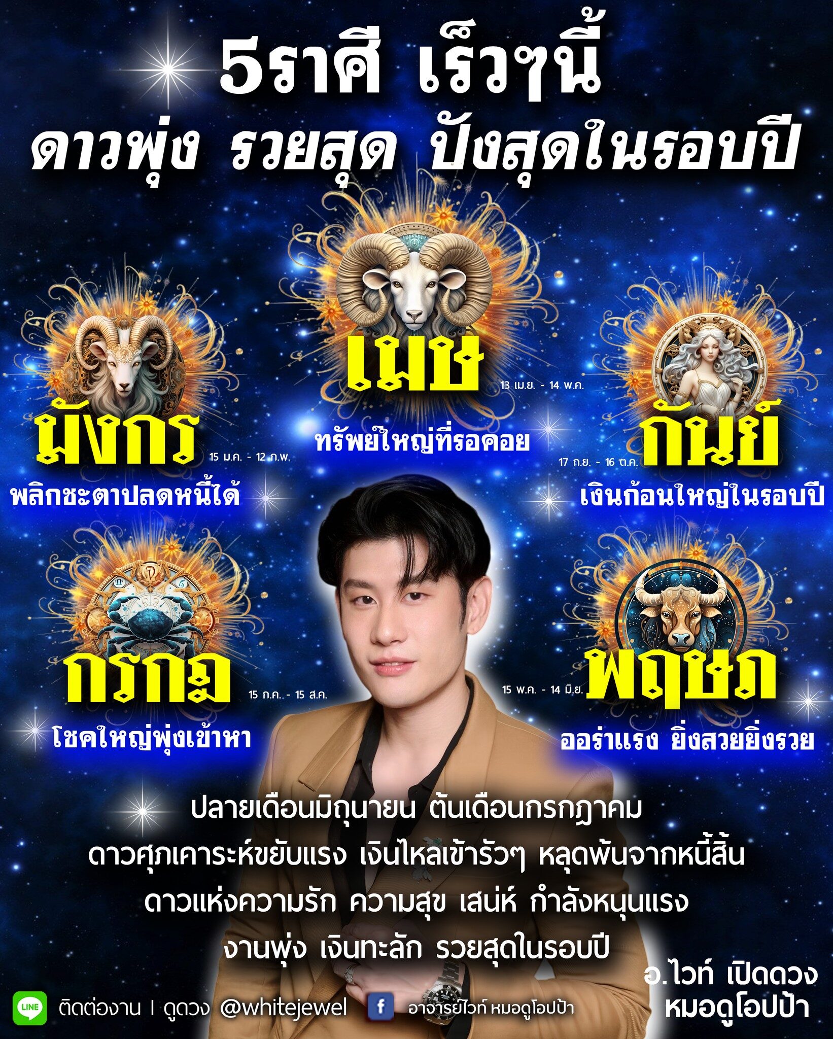 อาจารย์ไวท์ หมอดูโอปป้า เผยถึงดวงชะตาราศี เร็วๆ นี้ ดาวพุ่งรวยสุด ปังสุดในรอบปี ปลายเดือนมิ.ย. และต้นเดือนก.ค. ดาวศุภเคราะห์ขยับแรง เงินไหลเข้ารัวๆ หลุดพ้นจากหนี้สิน ดาวแห่งความรัก ความสุข เสน่ห์ กำลังหนุนแรง งานพุ่ง เงินทะลัก