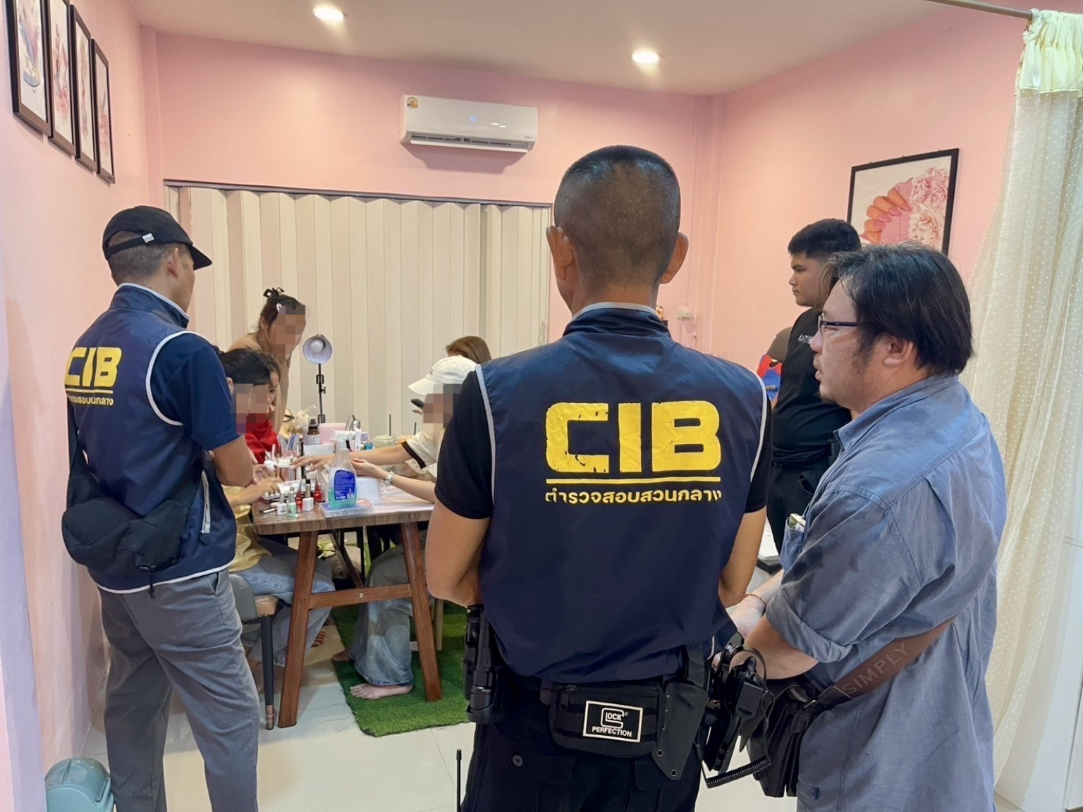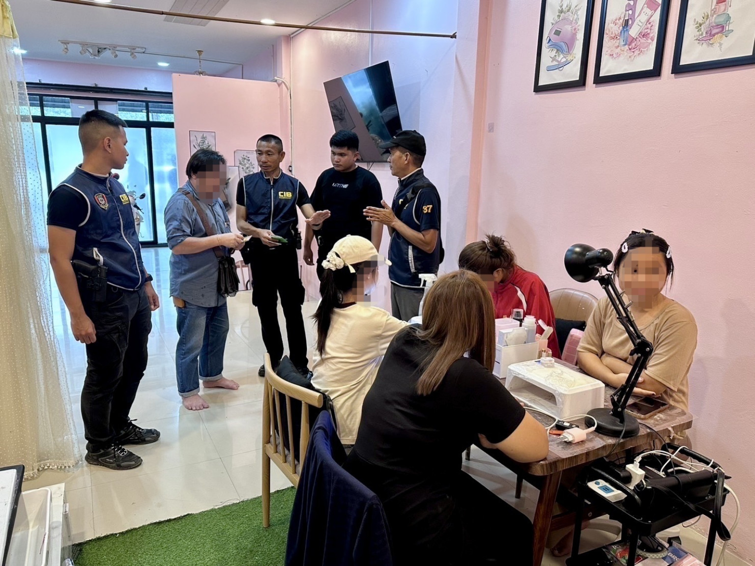 ขณะซุ่มแอบดู และสังเกตการณ์บริเวณหน้าร้านเป้าหมาย บ้านเลขที่ 296/3 ต.เขานิเวศน์ อ.เมืองระนอง จ.ระนอง ได้มีลูกค้าซึ่งเป็นสาวชาวเมียนมาด้วยกัน เข้าไปในร้าน พอได้เวลา จึงเข้าทำการตรวจสอบภายในร้าน จึงแสดงตัวเป็นเจ้าหน้าที่ตำรวจ พบช่างช่างเสริมสวยทั้ง 2 คน ทราบชื่อ น.ส.ติน เมียด อุง อายุ 21 ปี และ นส.มิน มิน ชู อายุ 21 ปี สัญชาติ เมียนมา กำลังต่อเล็บและตกแต่งสีเล็บ ให้กับผู้มาใช้บริการทั้ง 2 คน ในราคาเพียง 300 บาท