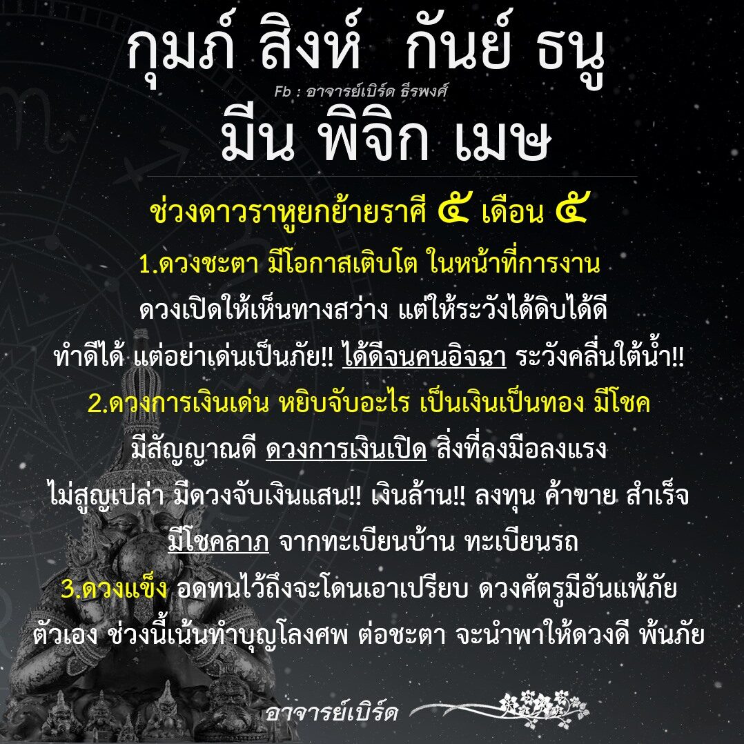 อาจารย์เบิร์ด ธีรพงศ์ เผยดวงชะตาราศี หลังดาวราหูย้าย ดวงชะตามีโอกาสเติบโต ในหน้าที่การงาน ดวงเปิดให้เห็นทางสว่าง แต่ระวังได้ดิบได้ดี ทำดีได้ แต่อย่าเด่นเป็นภัย ได้ดีจนคนอิจฉา ระวังคลื่นใต้น้ำ