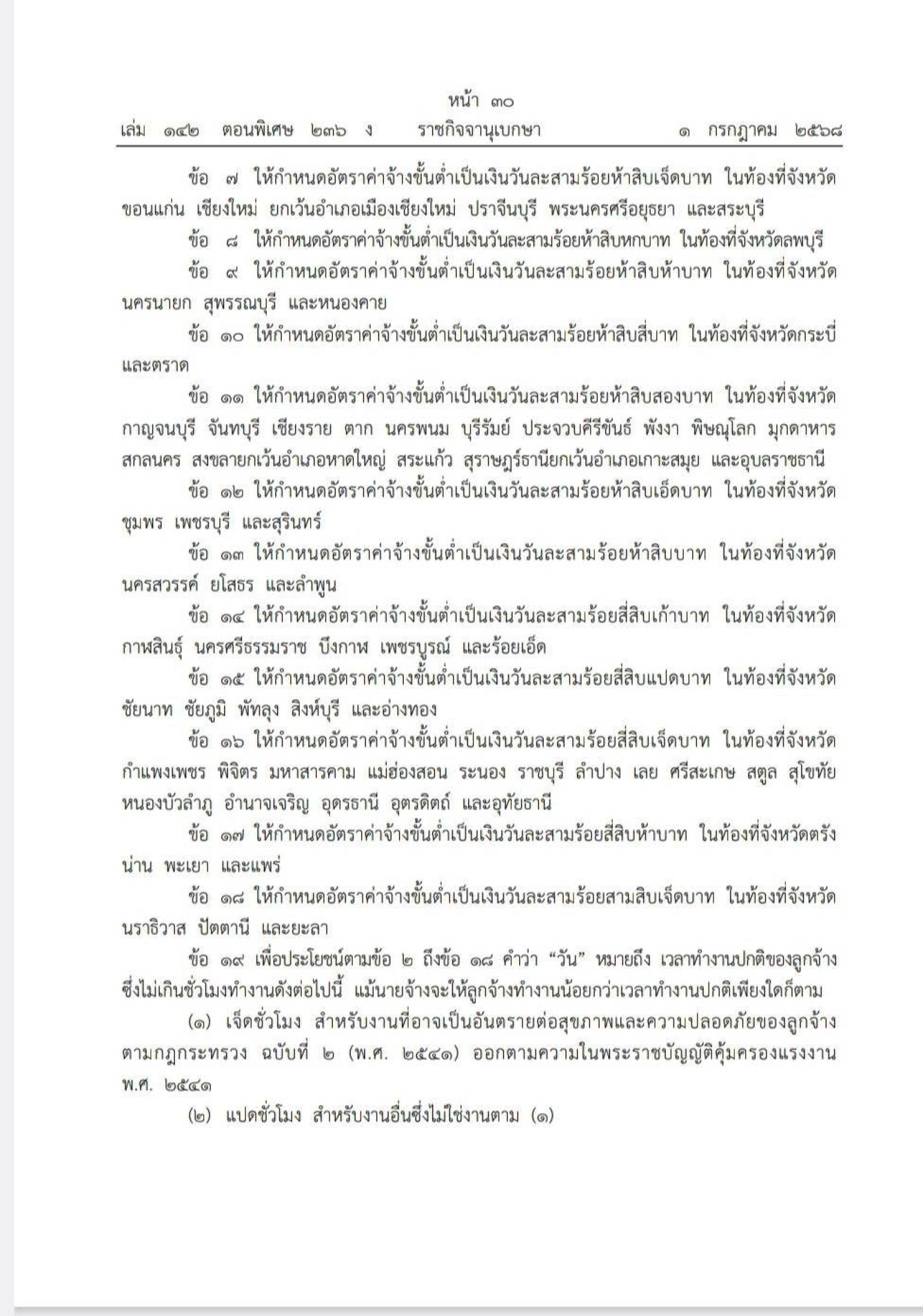 ข้อ 17 ให้กำหนดอัตราค่าจ้างขั้นต่ำเป็นเงินวันละ 345 บาท ในท้องที่จังหวัดตรัง น่าน พะเยา และแพร่ ข้อ 18 ให้กำหนดอัตราค่าจ้างขั้นต่ำเป็นเงินวันละ 337 บาท ในท้องที่จังหวัดนราธิวาส ปัตตานี และยะลา