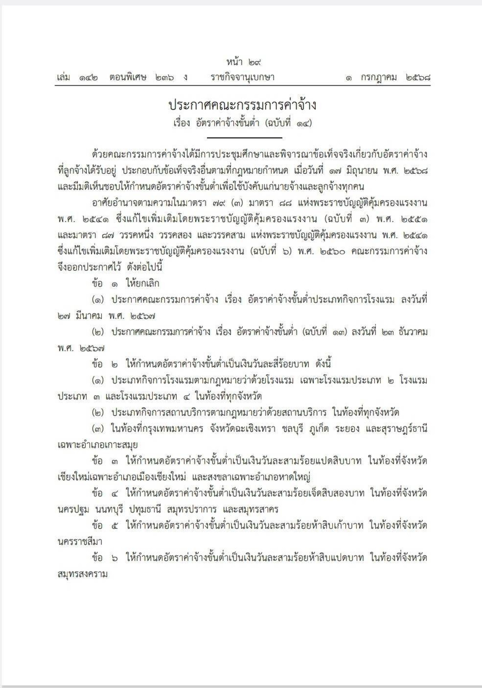 วันที่ 1 ก.ค.68 เว็บไซต์ราชกิจจานุเบกษาเผยแพร่ประกาศ ประกาศคณะกรรมการค่าจ้าง เรื่องอัตราค่าจ้างขั้นต่ำ (ฉบับที่ 14) ตามมติคณะกรรมการค่าจ้าง ขั้นต่ำ เมื่อวันที่ 17 มิ.ย.68 กำหนดค่าจ้างขั้นต่ำ เพื่อบังคับใช้แก่นายจ้าง และลูกจ้างทุกคน โดยใจความสรุป ให้กำหนดอัตราค่าจ้าจ้างขั้นต่ำเป็นวันวันละ 400 บาท ดังนี้ (1) ประเภทกิจการโรงแรมตามกฎหมายว่าด้วยโรงแรม เฉพาะโรงแรมประเภท 2 โรงแรม ประเภท 3 และโรงแรมประเภท 4 ในท้องที่ทุกจังหวัด
