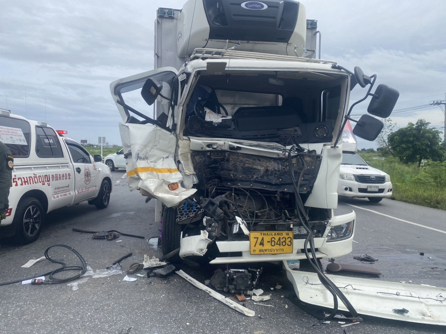 ในที่เกิดเหตุพบ รถบรรทุกหกล้อสองคัน คันแรกเป็น รถบรรทุกหกล้อ สีขาว ทะเบียน 74 – 6433 สมุทรปราการ จอดอยู่ในเลนขวาสุดมุ่งหน้าถนนเทพารักษ์ ในสภาพด้านหน้ารถยังยุบทั้งคัน โดยมี เอกนันต์ อายุ 34 ปี เป็นคนขับ อาการสาหัสติดคาหน้ารถ ส่วนคู่กรณีอีกคัน คือรถบรรทุกหกล้อ สีฟ้า ทะเบียน 82-4978 สมุทรสาคร จอดอยู่ในสภาพถูกชนท้ายพุ่งกระแทกราวสะพานและเกยรั้วกั้นเหล็กอยู่ โดยมีคนขับ คือนาย สุรชัย อายุ 39 ปี ได้รับบาดเจ็บสาหัสและติดคาอยู่ที่หน้ารถเช่นกัน ทีมกู้ภัยต้องใช้เครื่องตัดถ่างเข้างัดประตูรถและคอนโซนของรถบรรทุกทั้งสองคัน เพื่อช่วยเหลือคนขับออกมาปฐมพยาบาลและส่งตัวให้รถโรงพยาบาลรามาธิบดีจักรีนฤบดินทร์และโรงพยาบาลจุฬารัตน์ 3 ดำเนินการส่งต่อไปยังโรงพยาบาลใกล้เคียง โดยเจ้าหน้าที่ต้องปิดกั้นการจราจรบางส่วนเพื่อเร่งเคลียร์รถทั้งสองคันออกจากจุดเกิดเหตุ
