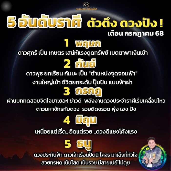 หมอบอย จัดอันดับ 5 ราศี ตัวตึง ดวงปัง เดือนกรกฎาคม 2568 ราศีใดเมตตาพาเงินเข้า ราศีใด ดาวมหาจักรทับดวง รวยติดจรวด พุ่ง เฮง ปัง