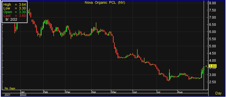 ผู้สื่อข่าวรายงานว่า วันนี้ (2 ก.ย.65) ราคาหุ้น บริษัท โนวา ออร์แกนิค จำกัด (มหาชน) หรือ NV ณ เวลา 10:11 น. อยู่ที่ระดับ 3.60 บาท บวก 0.30 บาท หรือ 9.09% สูงสุดที่ระดับ 3.64 บาท ต่ำสุดที่ระดับ 3.30 บาท ด้วยมูลค่าการซื้อขาย 60.34 ล้านบาท