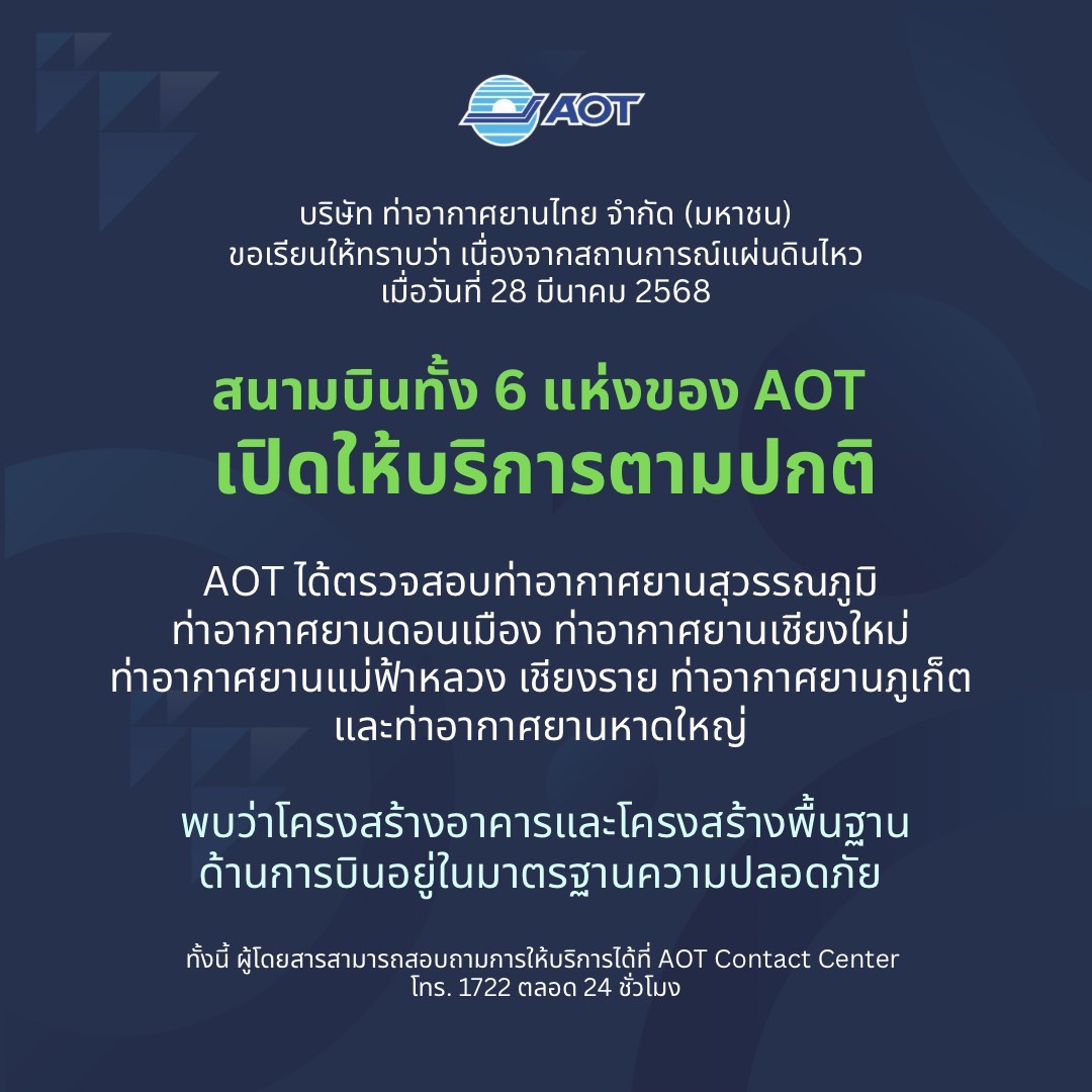 บริษัท ท่าอากาศยานไทย จำกัด (มหาชน) หรือ AOT หรือทอท. เปิดเผยว่า บริษัทได้ดำเนินการตรวจสอบระบบบริการ โครงสร้างพื้นฐาน และสิ่งอำนวยความสะดวกต่าง ๆ ของท่าอากาศยานทั้ง 6 แห่งในความดูแลทันที ภายหลังเกิดเหตุแผ่นดินไหวในประเทศไทยเมื่อวันที่ 28 มีนาคม 2568 ซึ่งส่งผลให้เกิดความเสียหายในบางพื้นที่ทั่วประเทศได้แก่ ท่าอากาศยานสุวรรณภูมิ ดอนเมือง เชียงใหม่ ภูเก็ต แม่ฟ้าหลวง เชียงราย และหาดใหญ่