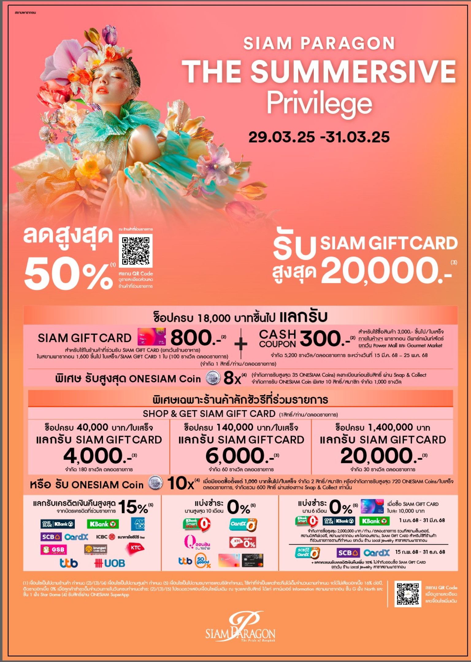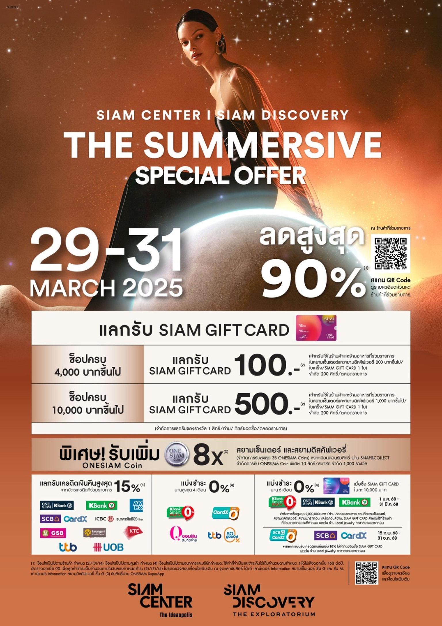 - ช้อปที่สยามเซ็นเตอร์และสยามดิสคัฟเวอรี่ ครบ 4,000 บาทขึ้นไป แลกรับ Siam Gift Card มูลค่า100 บาท ( 200 สิทธิ์ตลอดรายการ) และช้อปครบ 10,000 บาท แลกรับ Siam Gift Card มูลค่า 500 บาท (200 สิทธิ์ตลอดรายการ)