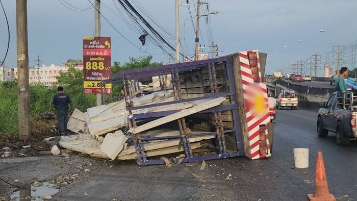 เสียงดังสนั่น รถบรรทุกแผ่นปูน พลิกคว่ำเกี่ยวสายไฟขาด หม้อแปลงระเบิด