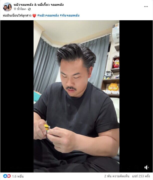 ทั้งยังโพสต์คลิปโมเมนต์น่ารักของสามี ขณะต่อของเล่นให้ลูกสาวด้วย แคปชั่นว่า “ต่อมินเนี่ยนให้ลูกสาว #หมิวจอมพลัง #กันจอมพลัง”