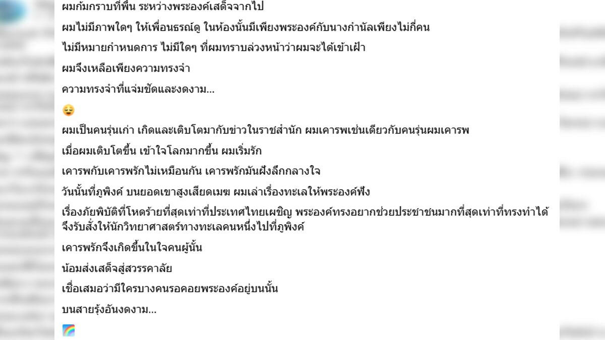 ผมเป็นคนรุ่นเก่า เกิดและเติบโตมากับข่าวในราชสำนัก ผมเคารพเช่นเดียวกับคนรุ่นผมเคารพ เมื่อผมเติบโตขึ้น เข้าใจโลกมากขึ้น ผมเริ่มรัก เคารพกับเคารพรักไม่เหมือนกัน เคารพรักมันฝังลึกกลางใจ