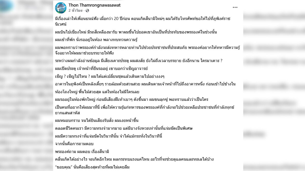 โดยเผยว่า เมื่อกว่า20 ปีก่อน ตอนเกิดสึนามิใหม่ ๆ ตนได้รับโทรศัพท์ขอให้ไปที่ภูพิงค์ราชนิเวศน์ เมื่อไปถึงเชียงใหม่ มีรถสีเหลืองมารับและพาขึ้นไปยอดเขาอันเป็นที่ประทับของพระองค์ในช่วงนั้น