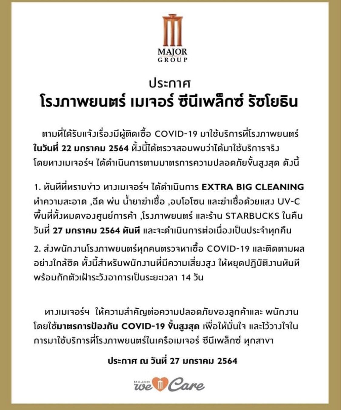 เมื่อวันที่ 27 ม.ค.64 ผู้สื่อข่าวรายงานว่า เมเจอร์กรุ๊ป ออกประกาศ ระบุว่า ตามที่ได้รับแจ้งเรื่องมีผู้ติดเชื้อ COVID-19 มาใช้บริการที่โรงภาพยนตร์ในวันที่ 22 มกราคม 2564 ทั้งนี้ได้ตรวจสอบพบว่ามาใช้บริการจริง โดยทางเมเจอร์ฯ ได้ดำเนินการตามมาตรการความปลอดภัยขั้นสูงสุด ดังนี้