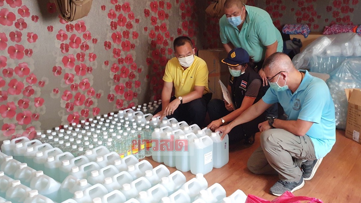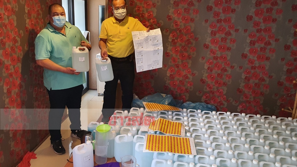 แอลกอฮอล์ 99.5% บรรจุแกลลอนขนาด 5 ลิตร 13 แกลลอน แอลกอฮอล์ 99.5% บรรจุแกลลอนขนาด 10 ลิตร 3 แกลลอน แอลกอฮอล์ 99.5%บรรจุถังขนาด 5 ลิตร 1 แกลลอน แอลกอฮอล์ 70% บรรจุแกลลอนขนาด 5 ลิตร 329 แกลลอน รวม 2,163 ลิตร เจ้าหน้าที่จึงตรวจยึด พร้อมอุปกร์การผลิตแอลกอฮอล์อีกหลายรายการ