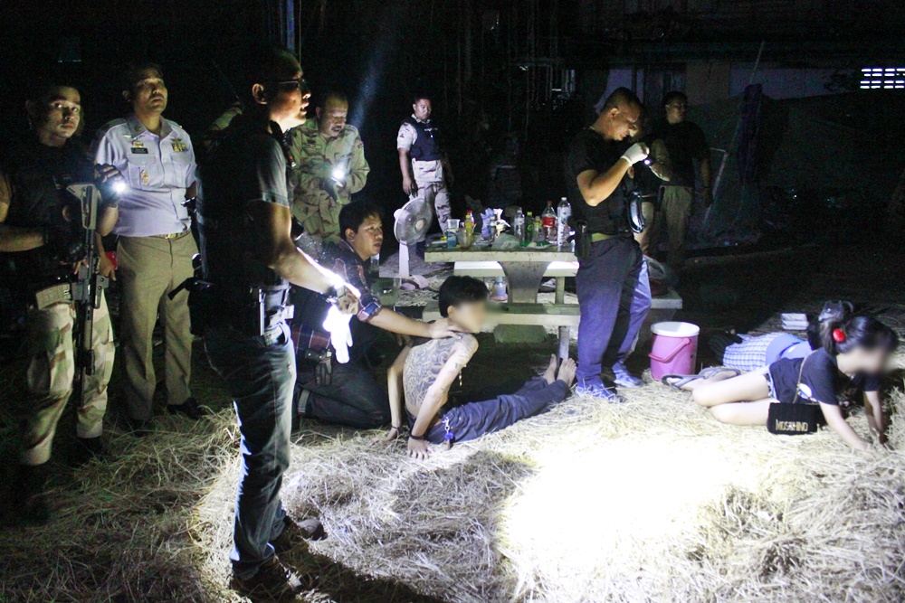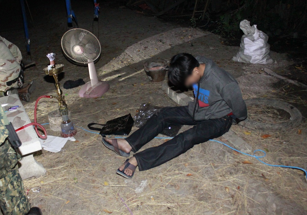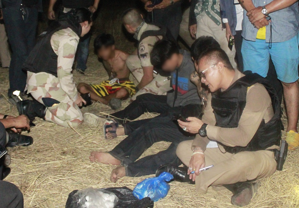 กำลังเจ้าหน้าที่บุกจู่โจมพร้อมกันบริเวณกลางทุ่งหลังบ้านเลขที่ดังกล่าวพบกลุ่มวัยรุ่น ชาย 3 คน หญิง 2 คนกำลังมั่วเสพ ยาอี ยาไอซ์ กันอยู่ผลตรวจค้นพบถุงบรรจุยาอี ไอซ์ ทิ้งเกลื่อนพื้นกระดาษฟอยล์ และเตาดูดบารากู่ และอาวุธปืนพกสั้นขนาด9 มม.พร้อมกระสุนจำนวน 8 นัด จึงควบคุมตัววัยรุ่นทั้ง 5 ไว้ทราบชื่อ นายภัทรกร หรือแบงก์ พวงพลี อายุ 18 ปี ชาวต.คลองหนึ่ง อ.คลองหลวง จ.ปทุมธานี และนายเบส อายุ 16 ปี นายเอ อายุ 17 ปี และน.ส.แสตมป์ อายุ 16 ปี น.ส.เซเว่น อายุ 16 ปี (ทั้งหมดนามสมมุติ)