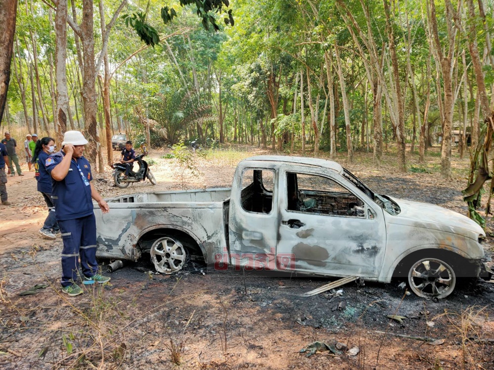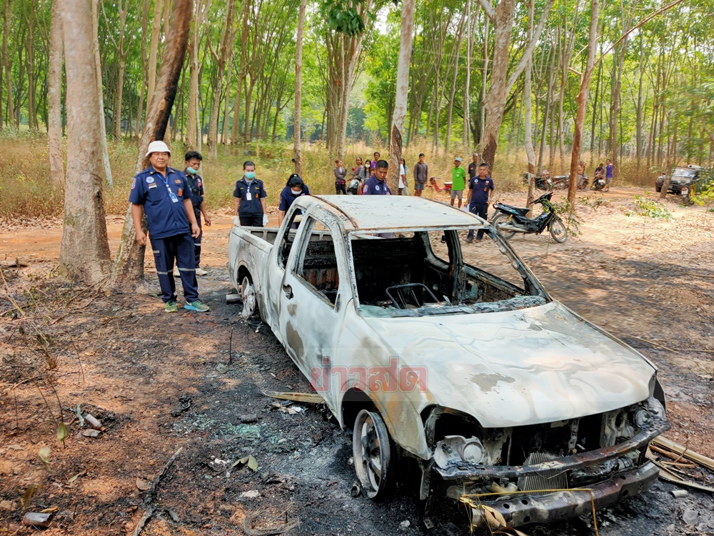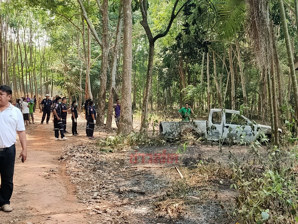 เมื่อไปถึงที่เกิดเหตุ ซึ่งอยู่ภายในสวนยางพารา พบรถกระบะ ยี่ห้ออีซูซุแค็ป สีขาว ไฟกำลังลุกไหม้ท่วมรถ หน่วยดับเพลิงจึงรีบใช้น้ำฉีดสกัดเพลิงจนสามารถดับไฟได้ทั้งหมด ตรวจสอบภายในรถถึงกับผงะ เมื่อพบร่างคนดำเป็นตอตะโก ไส้ทะลักออกมา เป็นที่อนาถใจแก่ผู้พบเห็นเป็นอย่างมาก ตรงหน้ารถพบขวดสุราที่คาดว่าผู้เสียชีวิตดื่มย้อมใจ ก่อนตัดสินใจเผาตัวเอง ตรวจสอบเบื้องต้นพบเป็นศพผู้ชาย ถูกไฟไหม้ทั้งคนทั้งรถวอดทั้งหมด จึงเก็บหลักฐานเตรียมนำตัวส่ง รพ.ระยอง เพื่อชันสูตรต่อไป
