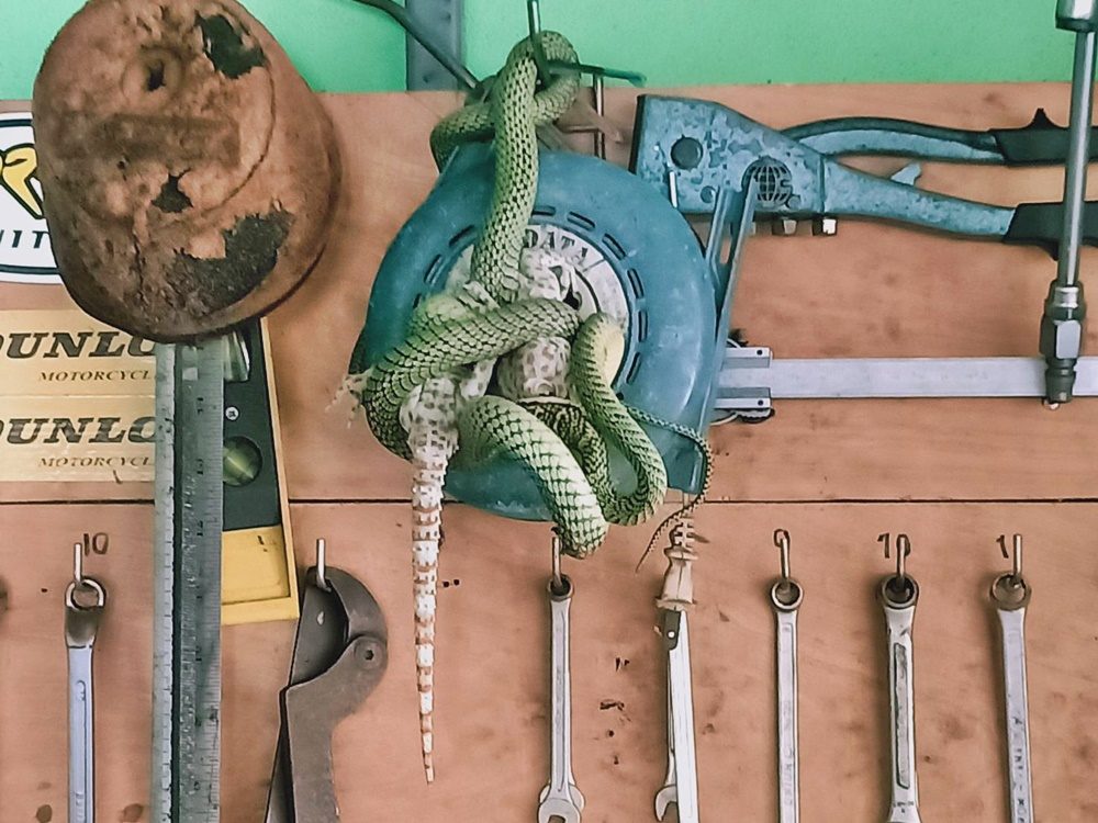 นายกิติพงษ์ กิติสกนธ์ หรือ ช่างโก้ เจ้าของบ้านเล่าว่า เช้าวันนี้ตนเปิดบ้าน ซึ่งทำเป็นพื้นที่ซ่อมรถจักรยานยนต์ กำลังจะไปเอาเครื่องมือที่แผงไฟ ก็มองเห็นงูเขียวกำรัดตัวตุ๊กแกอยู่ ตนตกใจมาก จึงแจ้งหน่วยกู้ภัยมาช่วยจับ เหตุการณ์แบบนี้ไม่เคยเห็นมาก่อนเลยในชีวิต เคยได้ยินแต่คนเฒ่าคนแก่เล่าให้ฟังว่างูเขียวชอบกินตับตุ๊กแก มาคราวนี้ได้เห็นกับตาตนเองเป็นครั้งแรก
