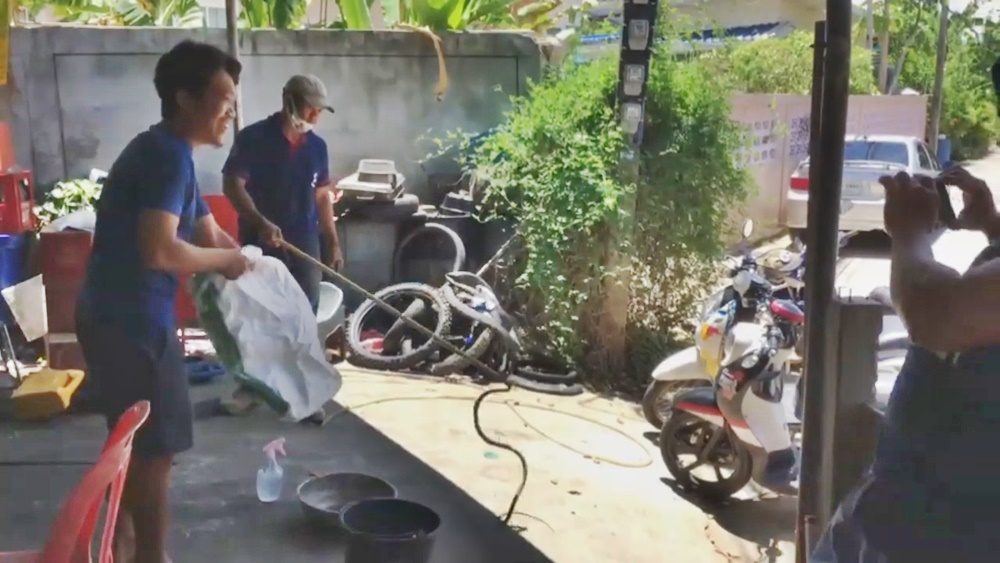 ส่วนตุ๊กแกตกลงมากับพื้นบ้านแน่นิ่งอยู่ไม่นาน พอได้สติตุ๊กแกก็คลานหลบหนีหายไปหลังบ้าน ส่วนงูเขียวความยาวประมาณ 80 เซนติเมตร หน่วยกู้ภัยนำไปปล่อยคืนสู่ธรรมชาติต่อไป