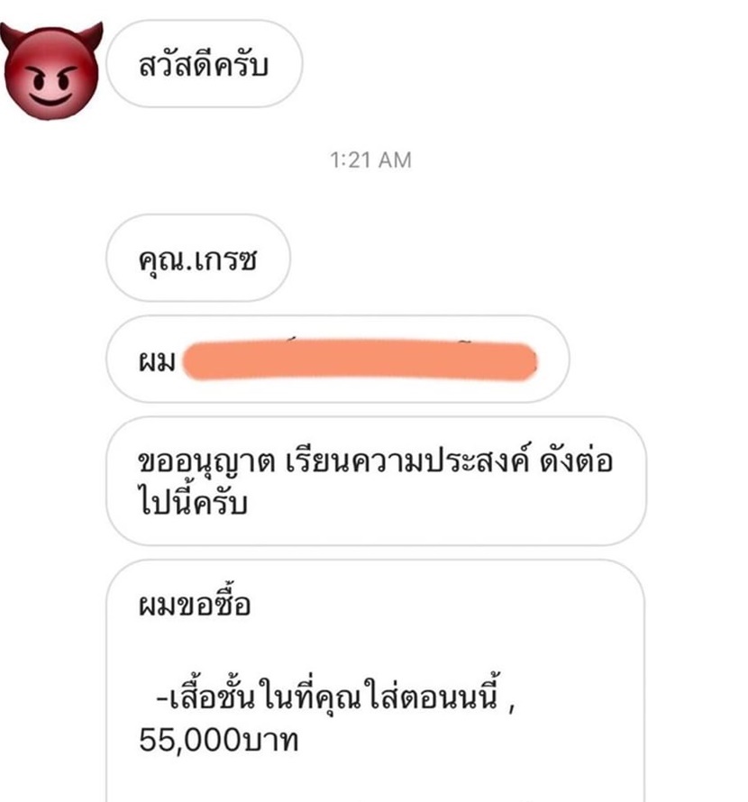 น.ส.ฐรินดา กล่าวต่อว่า ตนจึงตอบไปว่าไม่รับงานแบบนี้ จากนั้นชายคนดังกล่าวจึงยื่นข้อเสนอมาว่า ให้ส่งชุดชั้นในมาก็ได้ พร้อมกับติดต่อขอซื้อขนเพชรจำนวน 5 เส้น ในราคา 5 หมื่นบาท และชายโรคจิตดังกล่าว ก็พยายามจะวิดีโอคอลมาตลอดเวลา แต่ตนไม่รับ พอตนไม่รับก็จะส่งภาพอนาจารของตัวเองมาให้ ซึ่งตนก็บล็อคไป โดยชายโรคจิตยังส่งข้อความบอกอีกว่าถ้าบล็อคเขา เขาก็จะตามไปทุกช่องทาง เขามีบัญชีไอจี และเฟซบุ๊กรวมกว่า 50 บัญชี จะตามระรานไปตลอด