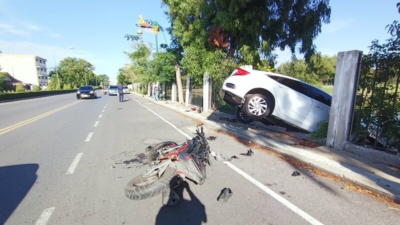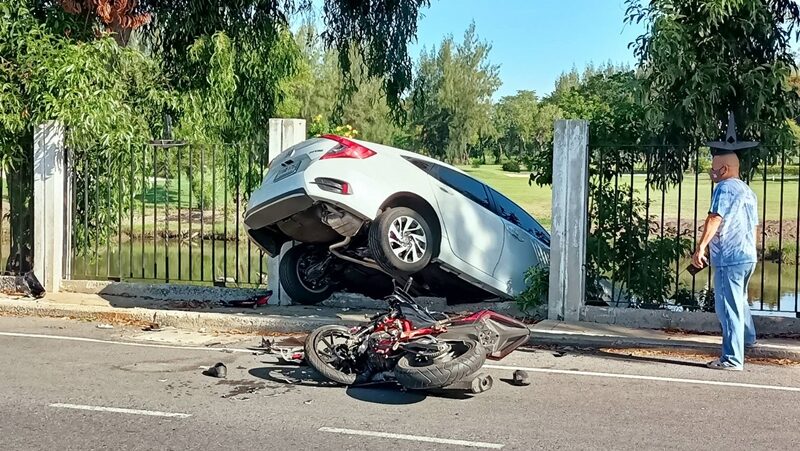 จยย.ชนเก๋ง รถเสียหลักพุ่งทะลุกำแพง สนามกอล์ฟ พังยับ ร่างกระเด็นเจ็บ