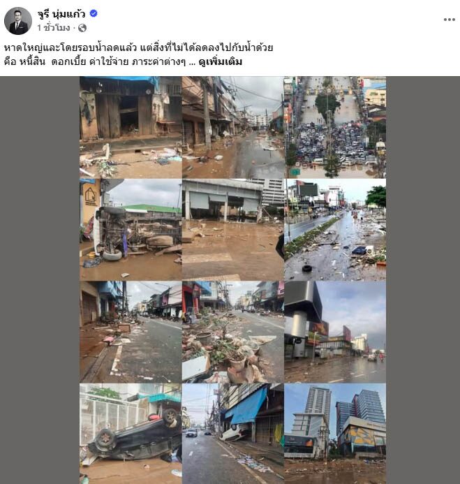 วันที่ 27 พ.ย. 2568 นายจูรี นุ่มแก้ว รองหัวหน้าพรรคประชาธิปัตย์ โพสต์เฟซบุ๊กถึงเหตุการณ์ น้ำท่วมหาดใหญ่ จ.สงขลา ว่า หาดใหญ่และโดยรอบน้ำลดแล้ว แต่สิ่งที่ไม่ได้ลดลงไปกับน้ำด้วย คือ หนี้สิน ดอกเบี้ย ค่าใช้จ่าย ภาระค่าต่างๆ