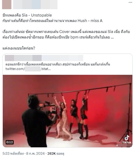 เรื่องท่าเต้นน่ะ ชัดมากเพราะเคยเต้น Cover เพลงนี้ แต่เพลงของแม่ Sia เนี่ย ถึงกับต้องไปเปิดเพลงซ้ำอีกรอบ ก็คือห้องบีทเป๊ะ bpm เรนจ์เดียวกันไปเลย …