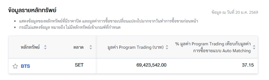 โดยบริษัท บีทีเอส กรุ๊ป โฮลดิ้งส์ จำกัด (มหาชน) หรือ BTS มีมูลค่าการซื้อขายผ่าน Program Trading จำนวน 69.42 ล้านบาท คิดเป็น 37.15% ของมูลค่าการซื้อขายแบบ Auto Matching ซึ่งอยู่ที่ 186.90 ล้านบาท