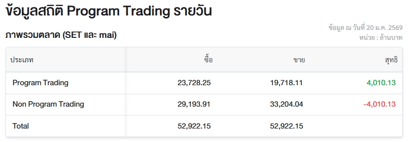 ขณะที่มูลค่าซื้อขายรายวันผ่าน Non Program Trading หรือ “การซื้อขายที่ไม่ใช่โปรแกรม” มีมูลค่าซื้อจำนวน 29,193.91 ล้านบาท และมูลค่าขายจำนวน 33,204.04 ล้านบาท เท่ากับขายสุทธิ 4,010.13 ล้านบาท