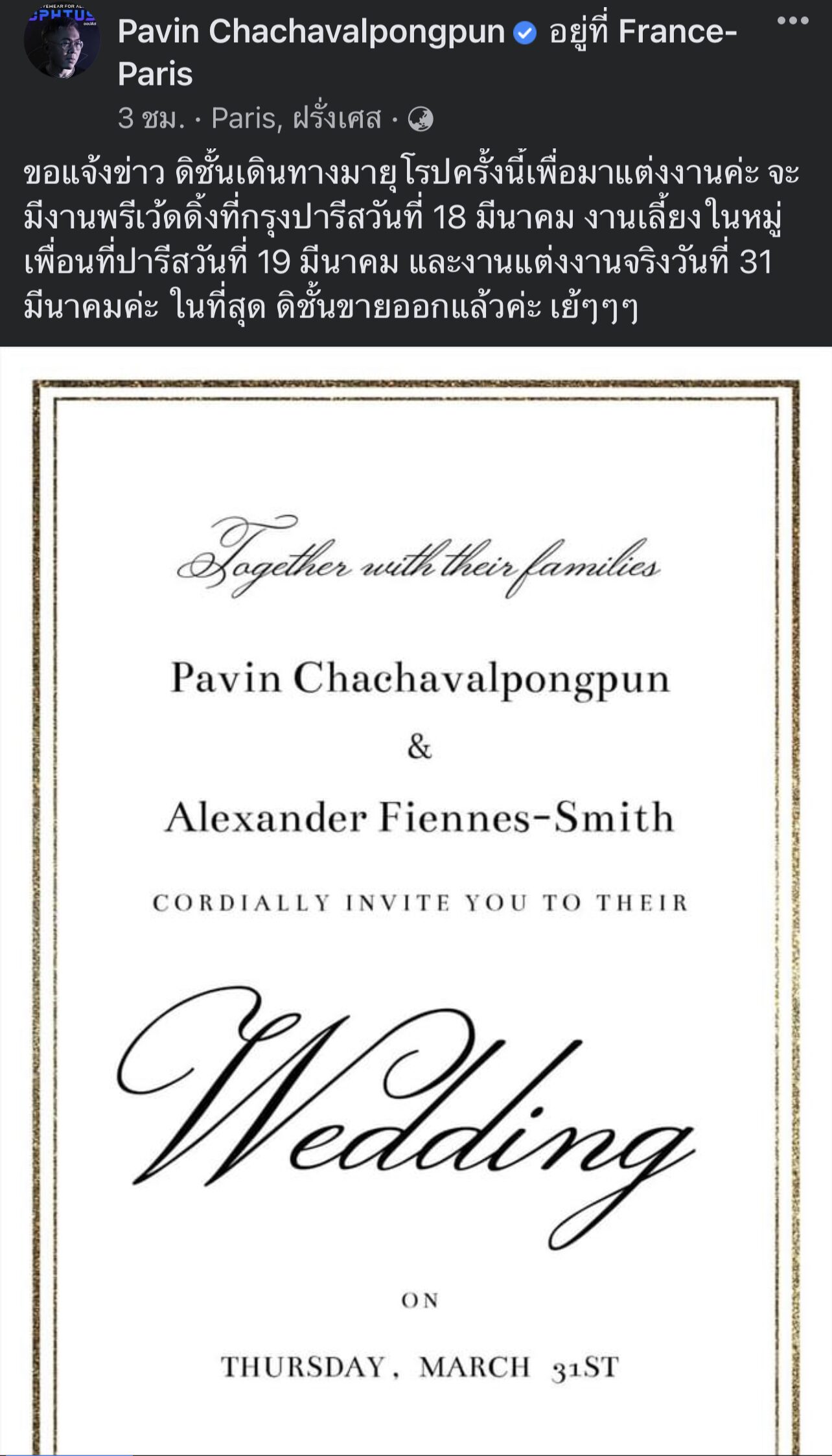 เขายังระบุอีกว่า โดยทริปการมายุโรปในครั้งนี้ ก็เดินทางมาเพื่อแต่งงาน จะมีพรีเวดดิ้ง ในวันที่ 18 มีนาคม และจัดงานเลี้ยงในหมู่เพื่อน วันที่ 19 มีนาคม และเข้าพิธีแต่งงานในวันที่ 31 มีนาคม ที่กรุงปารีส อีกด้วย