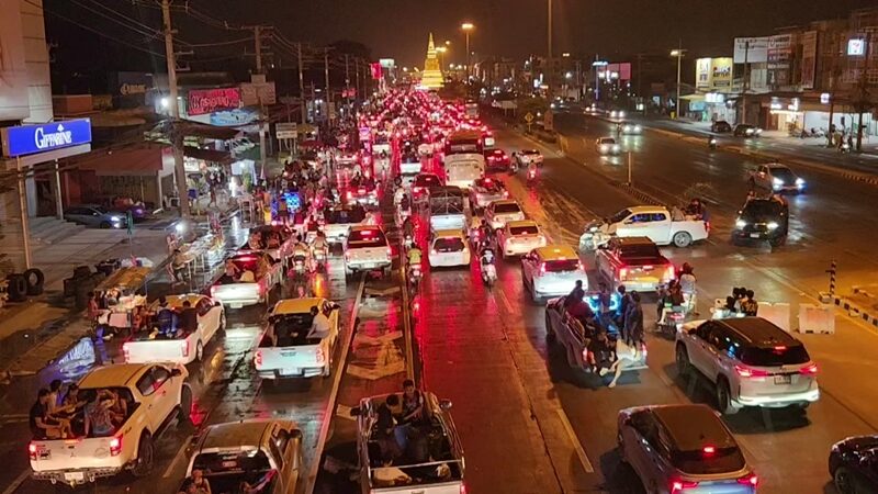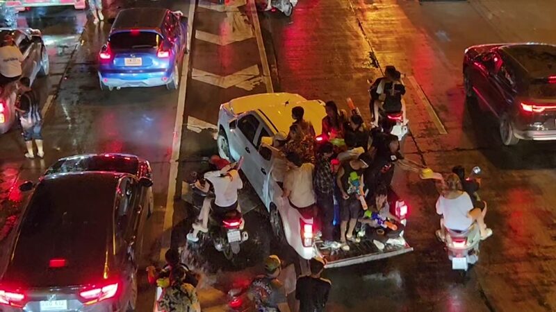 ตั้งแต่ช่วงถนนโรจนะ บริเวณสี่แยกวัดพระญาติ มุ่งหน้าเข้าสู่เกาะเมือง จนบริเวณวงเวียนเจดีย์วัดสามปลื้ม พบประชาชนจำนวนมากนำรถกระบะบรรทุกน้ำออกมาร่วมเล่นสาดน้ำอย่างสนุกสนาน หลายจุดเปิดเพลงสร้างสีสัน มีทั้งกลุ่มวัยรุ่นและครอบครัวออกมาเล่นน้ำริมถนนต่อเนื่อง ส่งผลให้การจราจรเคลื่อนตัวได้ช้าและมีรถสะสมเป็นระยะตลอดแนวเส้นทาง