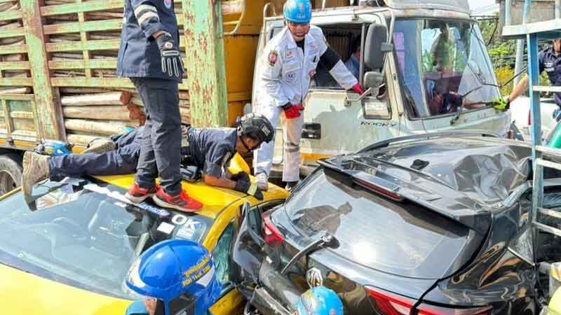 พยายามเบรกแล้ว แต่ก็ไม่สามารถหยุดรถได้ เพราะรถบรรทุกไม้เต็มคันมีน้ำหนักหลายตัน ตนจึงดับเครื่อง ปรากฏว่ารถยิ่งวิ่งไหลไปแรงกว่าเดิม เพราะเป็นช่วงทางลงสะพานต่างระดับ และกำลังจะขึ้นสะพานถนนเพชรเกษม จนกระทั่งชนกับรถจยย.และต่อเนื่องไปชนอีกหลายคนดังกล่าวเบื้องต้นเจ้าหน้าที่ได้ส่งตัวนายจำปี ไปรักษาตัวที่โรงพยาบาลสุขสวัสดิ์ หลังออกจากโรงพยาบาลพนักงานสอบสวนจะได้เรียกตัวมาแจ้งข้อกล่าวหา