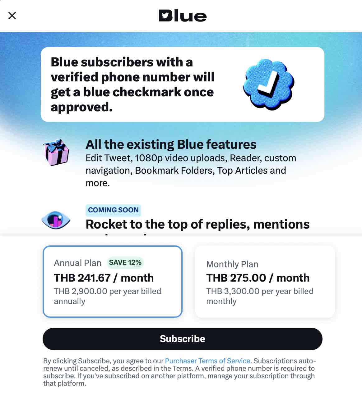 สำหรับราคารายเดือนของบริการดังกล่าวนั้น รายเดือนจะอยู่ที่ 275 บาท และรายปีอยู่ที่ 2,900 บาท แต่ถ้าหากสมัครบริการผ่าน Android หรือ iOS นั้นจะต้องบวกค่าบริการเพิ่มขึ้น เนื่องจาก Twitter ต้องแบ่งส่วนแบ่งให้กับ Google รวมถึง Apple