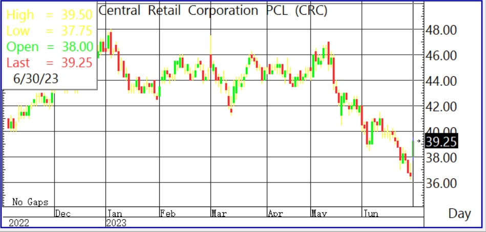 ผู้สื่อข่าวรายงานว่า วันนี้ (30 มิ.ย. 66) ราคาหุ้น บริษัท เซ็นทรัล รีเทล คอร์ปอเรชั่น จำกัด (มหาชน) หรือ CRC ล่าสุดปิดภาคเช้าอยู่ที่ระดับ 39.25 บาท บาท บวก 2.75 บาท หรือ 7.53% สูงสุดที่ระดับ 39.50 บาท ต่ำสุดที่ระดับ 37.75 บาท ด้วยมูลค่าการซื้อขาย 645.31 ล้านบาท