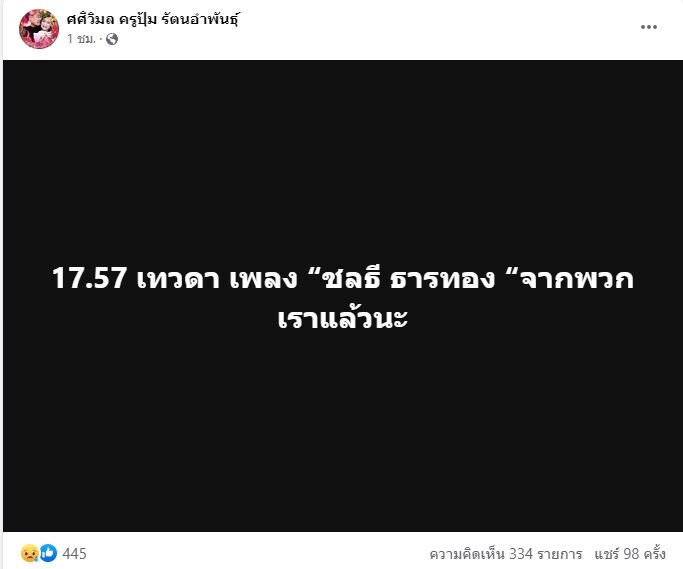 เมื่อวันที่ 21 ก.ค.66 เพจ ศศิวิมล ครูปุ้ม รัตนอำพันธุ์ โพสต์ข้อความเศร้าที่เกิดขึ้นในวงการเพลงลูกทุ่ง เมื่อครูชลธี ธารทอง ศิลปินแห่งชาติ ได้เสียชีวิตแล้วในวัย 85 ปี โดยโพสต์เฟซบุ๊กระบุว่า “17.57 เทวดา เพลง ‘ชลธี ธารทอง’ จากพวกเราแล้วนะ”