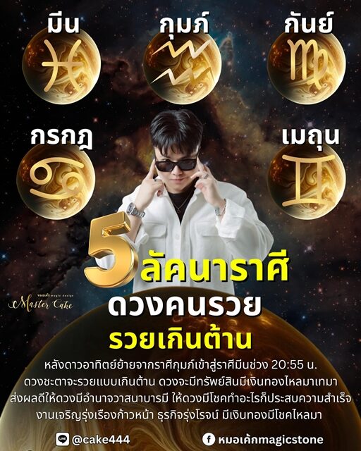 หมอเค้ก Magic stone เปิดชะตา 5 ลัคนาราศี ดวงคนรวย รวยเกินต้าน หลังดาวอาทิตย์ย้ายเข้าสู่ราศีมีน ดวงจะมีทรัพย์มีเงินทองไหลมาเทมา ประกอบด้วย ราศีมีน ราศีกุมภ์ ราศีกันย์ ราศีกรกฎ และ ราศีเมถุน