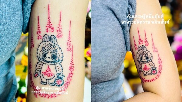 โดยวันนั้นน้องสาวของตนมาช่วยเลี้ยงหลาน และน้องสาวของตนก็ชอบลาบูบู้มากเช่นเดียวกัน ก็เลยได้สักยันต์ตามลายนั้นเลย แต่ตอนนี้ยังไม่ได้ลงสีต้องนัดมาลงสีอีกครั้ง
