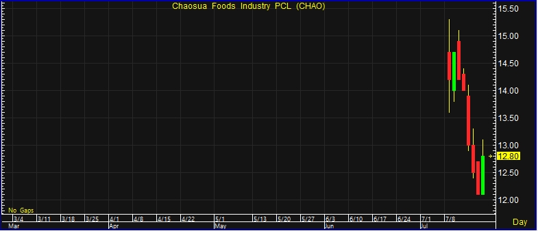 ผู้สื่อข่าวรายงานว่า วันนี้ (18 ก.ค.67) ราคาหุ้น บริษัท เจ้าสัว ฟู้ดส์ อินดัสทรี จำกัด (มหาชน) หรือ CHAO ปิดตลาดที่ระดับ 12.80 บาท บวก 0.70 บาท หรือ 5.79% ราคาสูงสุด 13.10 บาท ราต่ำสุด 12.10 บาท ด้วยมูลค่าซื้อขาย 91.82 ล้านบาท
