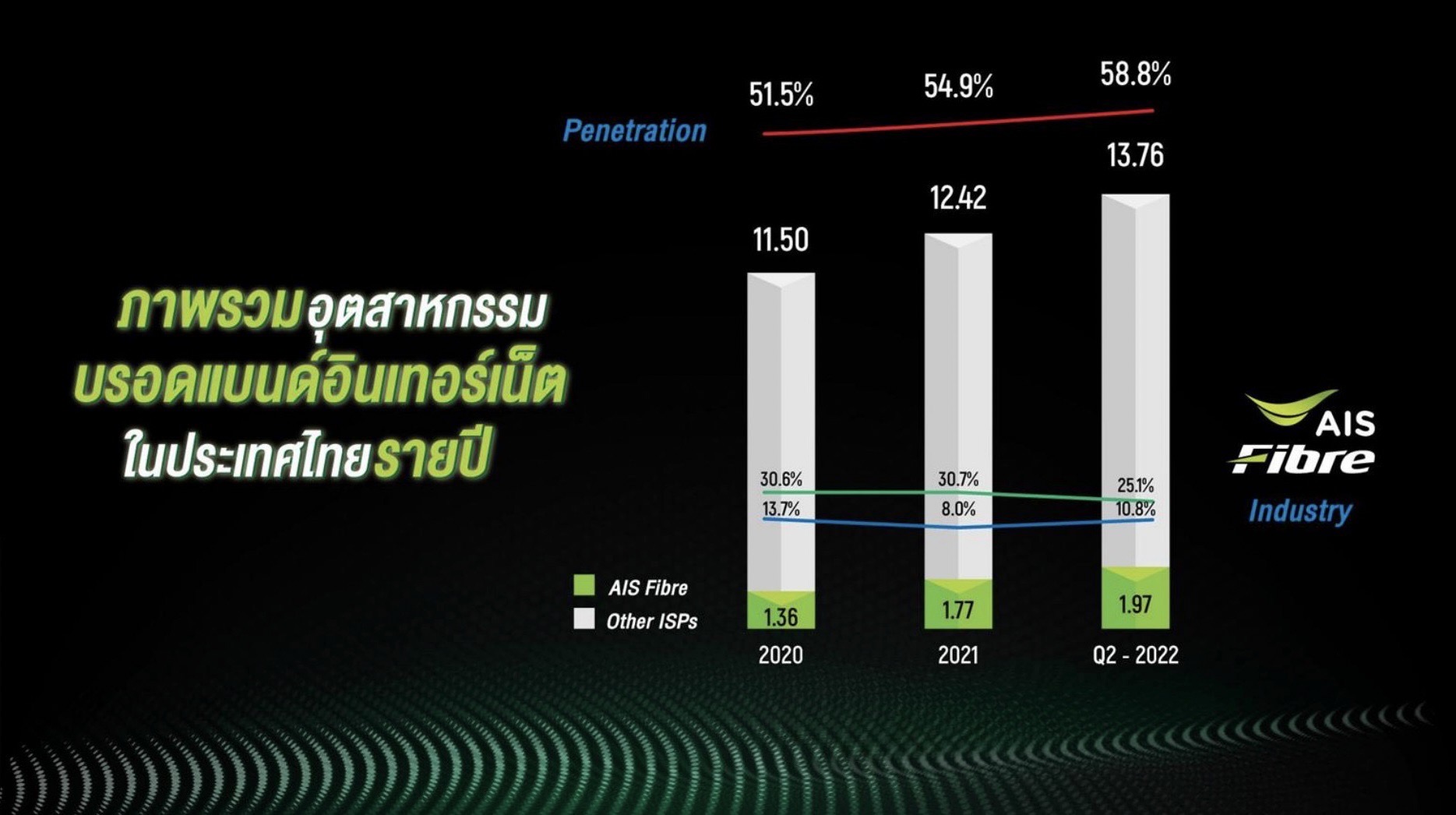 สำหรับตลาดโมบายในปัจจุบัน จำนวนเลขหมายนั้นมากกว่าจำนวนประชากรไทยไปนานแล้ว การแข่งขันจึงเน้นไปที่การดึงลูกค้าย้ายค่ายหรือเบอร์ที่ 2-3 แต่สำหรับเน็ตบ้านนั้นดูเหมือนจะยังมีช่องว่างให้เติบโตมากกว่า โดย Internet Broadband Penetration ในประเทศไทย ปัจจุบันมีประมาณ 58.8% หรือราว 13 ล้านครัวเรือน จาก 20 ล้านครัวเรือน