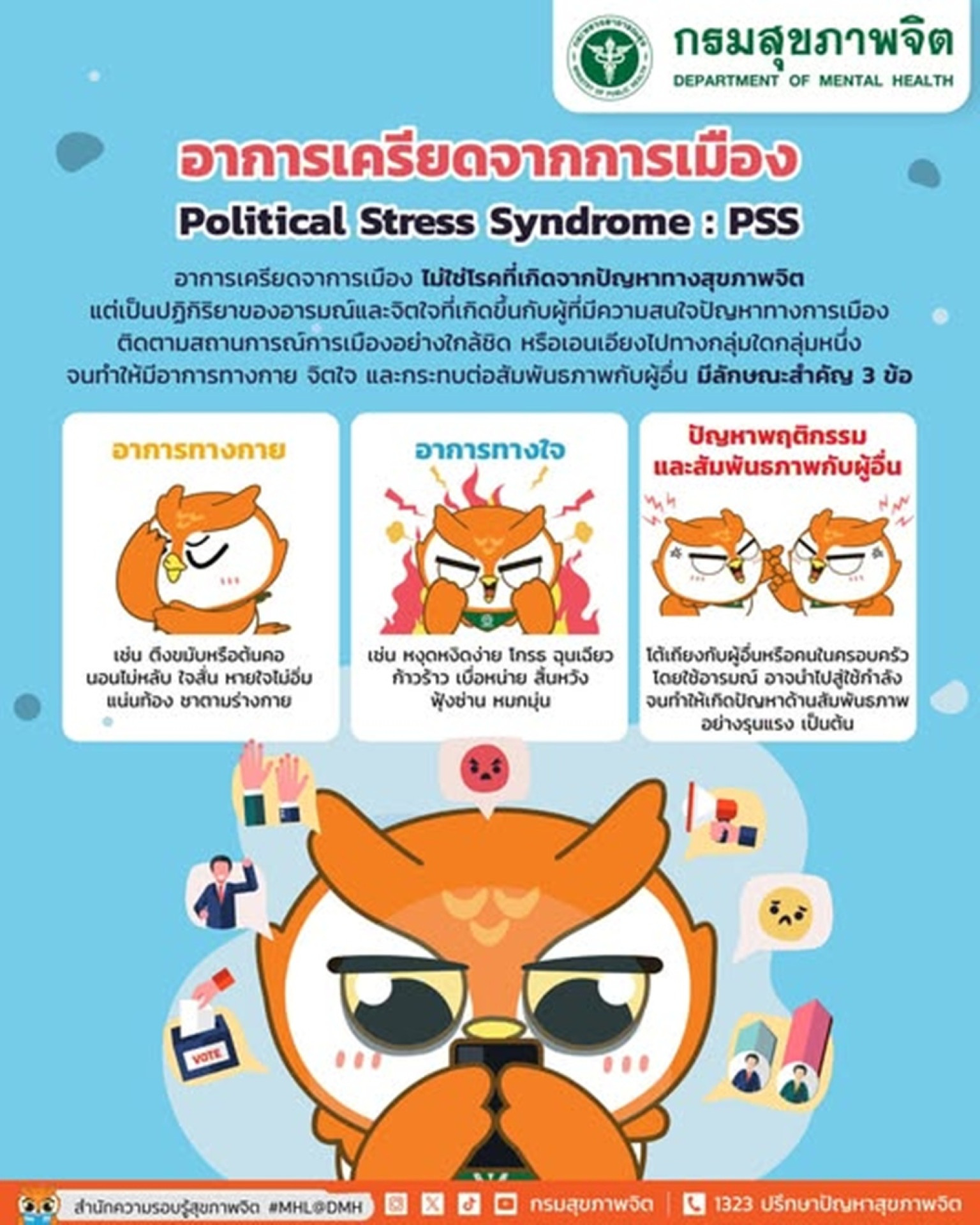 เมื่อวันที่ 19 มิ.ย.68 กรมสุขภาพจิต แจ้งเตือนประชาชนระวังอาการเครียดจากสถานการณ์การเมือง หรือ Political Stress Syndrome (PSS) ซึ่งส่งผลทั้งทางกาย ใจ และความสัมพันธ์ ขอให้ใช้สติรับฟังข้อมูลอย่างรอบคอบ หลีกเลี่ยงถ้อยคำรุนแรง และดูแลใจด้วย 5 วิธี คือ รู้เท่าทันอารมณ์ จำกัดเวลาติดตามข่าว ดำรงชีวิตสมดุล เคารพความคิดเห็นที่หลากหลาย และพักผ่อนผ่อนคลายอย่างเหมาะสม