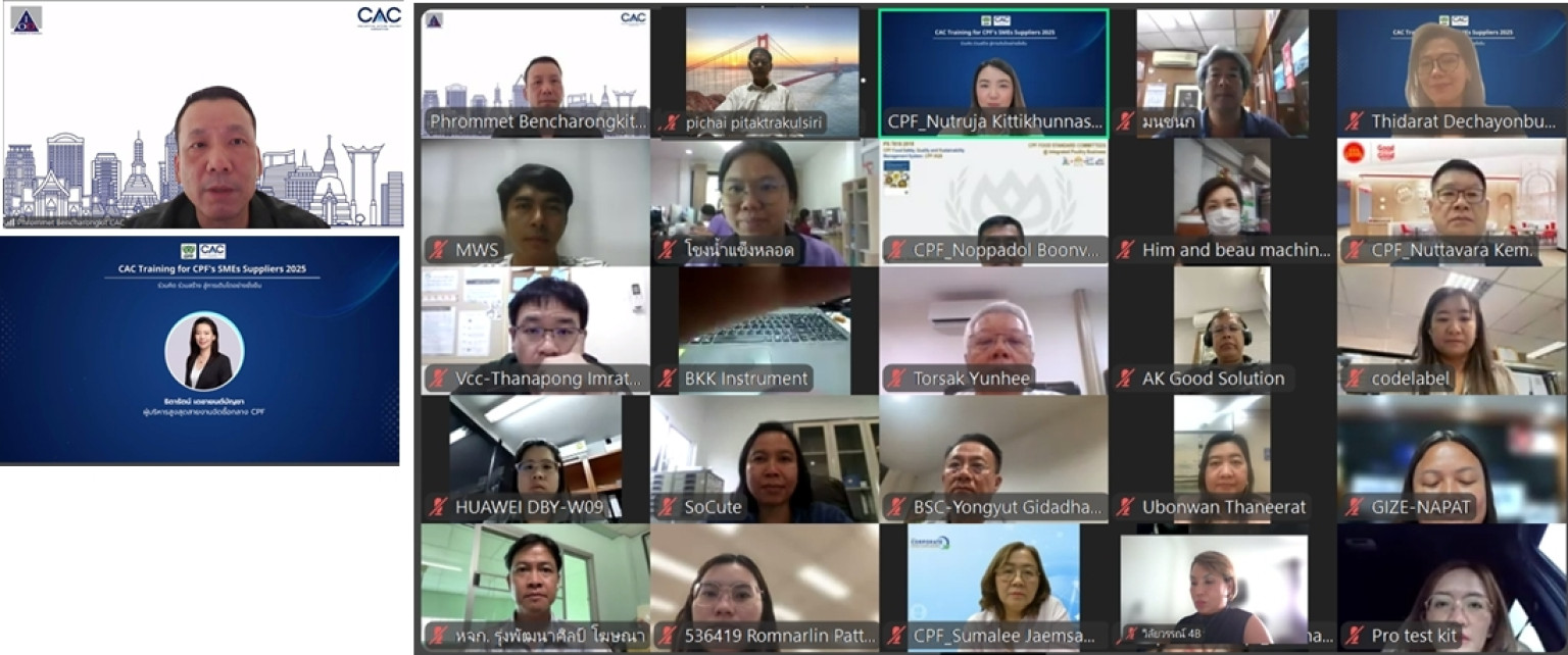 นางสาวธิดารัตน์ เดชายนต์บัญชา ผู้บริหารสูงสุดสายงานจัดซื้อกลางซีพีเอฟ กล่าวว่า การจัดงาน CAC Training for CPF's SMEs Suppliers ถือเป็นหนึ่งในกิจกรรมภายใต้โครงการ Partner to Grow ที่มุ่งพัฒนาศักยภาพคู่ค้าในห่วงโซ่คุณค่าของบริษัททั้งในมิติเศรษฐกิจ สังคม สิ่งแวดล้อม และธรรมาภิบาล ภายใต้แนวคิด "Partnership for Mutual Growth – ร่วมคิด ร่วมสร้าง เติบโตอย่างยั่งยืน" นอกจากการส่งเสริมองค์ความรู้ ซีพีเอฟยังให้การสนับสนุนคู่ค้าในบทบาทที่ปรึกษาตลอดกระบวนการ การสมัครเข้าร่วมโครงการกับ CAC จนถึงการขอรับรอง CAC SME Certification ซึ่งเป็นกุญแจสำคัญในการยกระดับความน่าเชื่อถือ และเปิดโอกาสทางธุรกิจทั้งในประเทศและต่างประเทศ