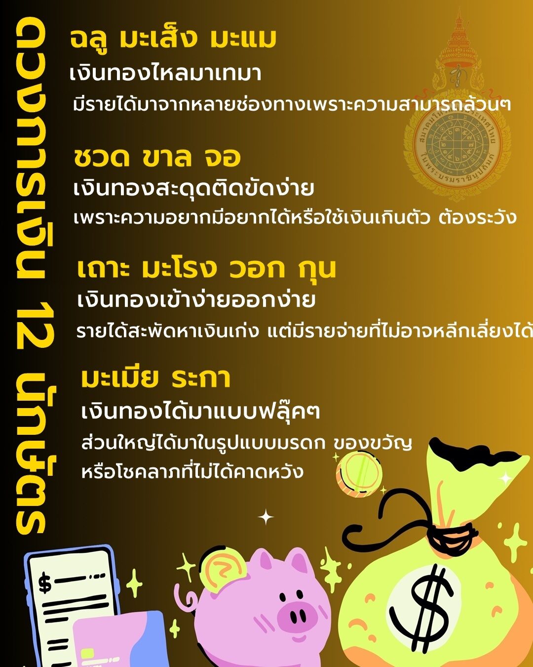 สมาคมโหรแห่งประเทศไทย ในพระบรมราชินูปถัมภ์ เผยถึงดวงชะตาการเงินของนักษัตร ประจำเดือนกรกฎาคม 2568 เงินทองไหลมาเทมา มีรายได้มาจากหลายช่องทาง เพราะความสามารถล้วนๆ