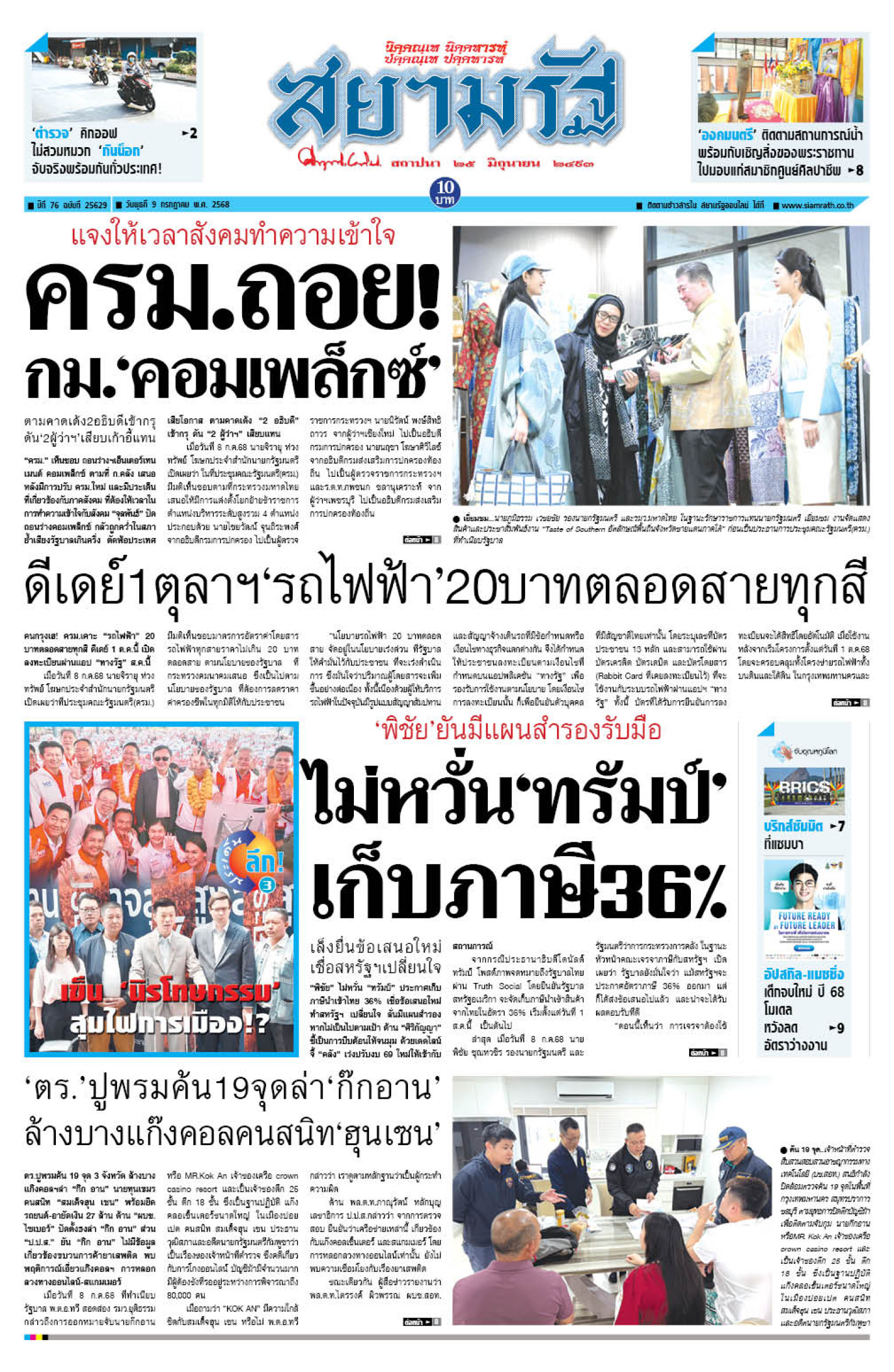 หน้า 1 หนังสือพิมพ์สยามรัฐรายวัน ฉบับวันพุธที่ 9 กรกฎาคม 2568