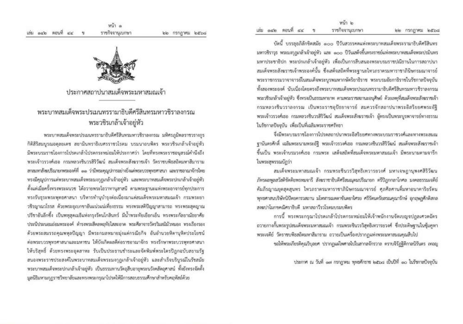 ราชกิจจาฯ เผยแพร่ประกาศสถาปนา "สมเด็จพระมหาสมณเจ้า กรมพระชินวรวิสุทธิเทวารยวงศ์"